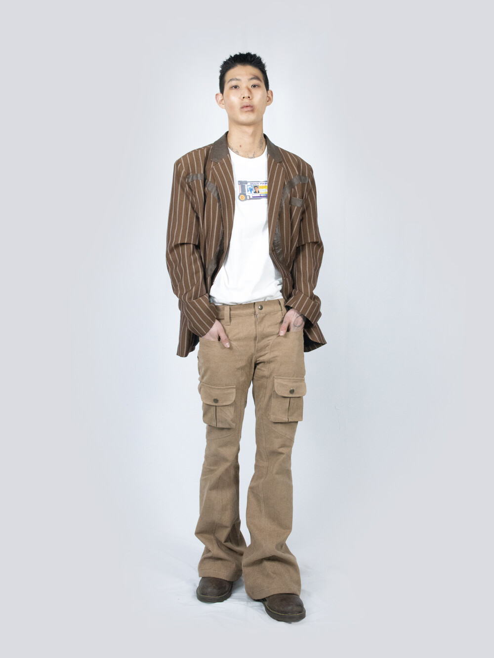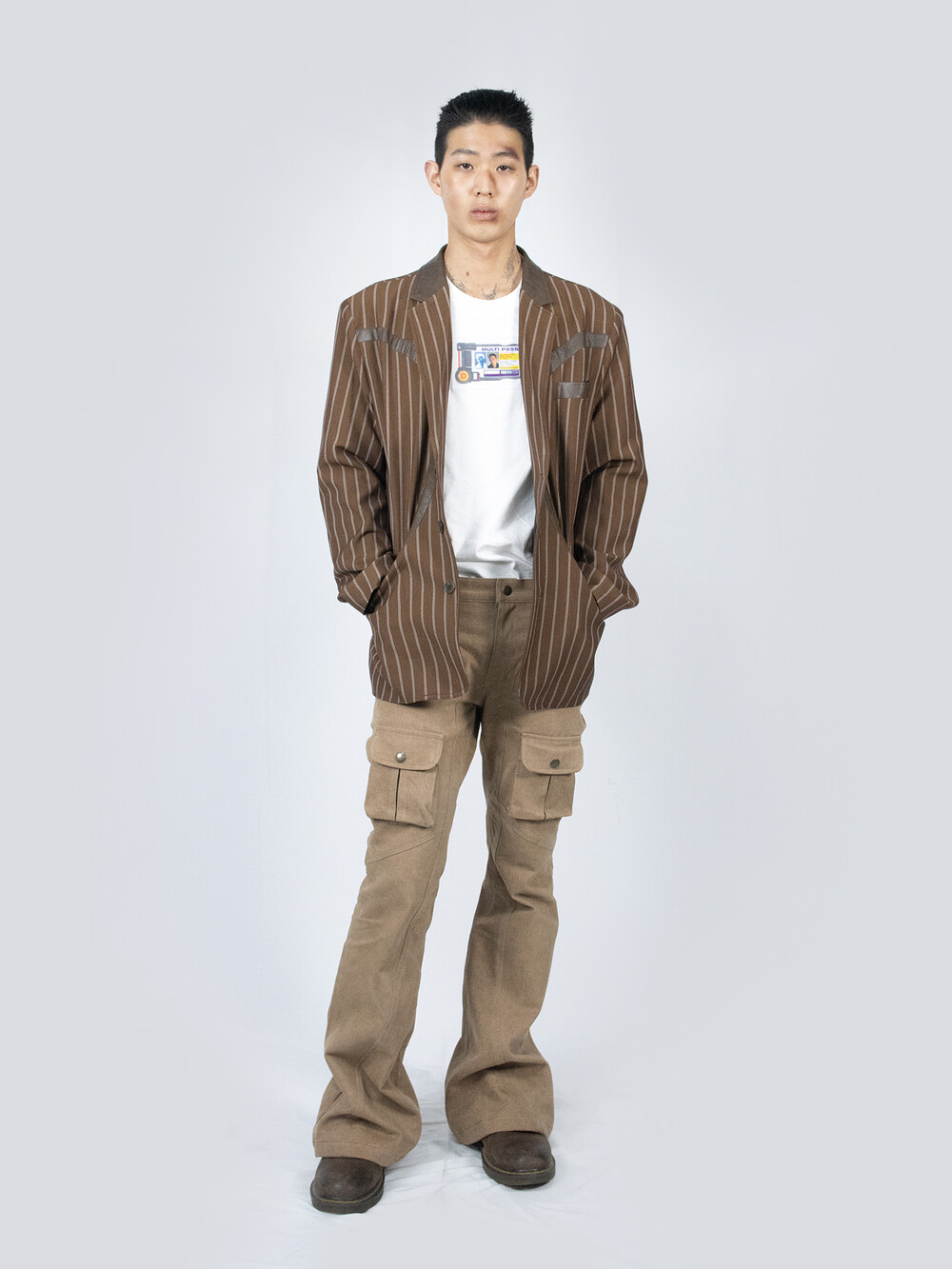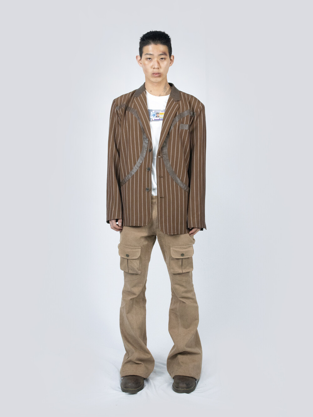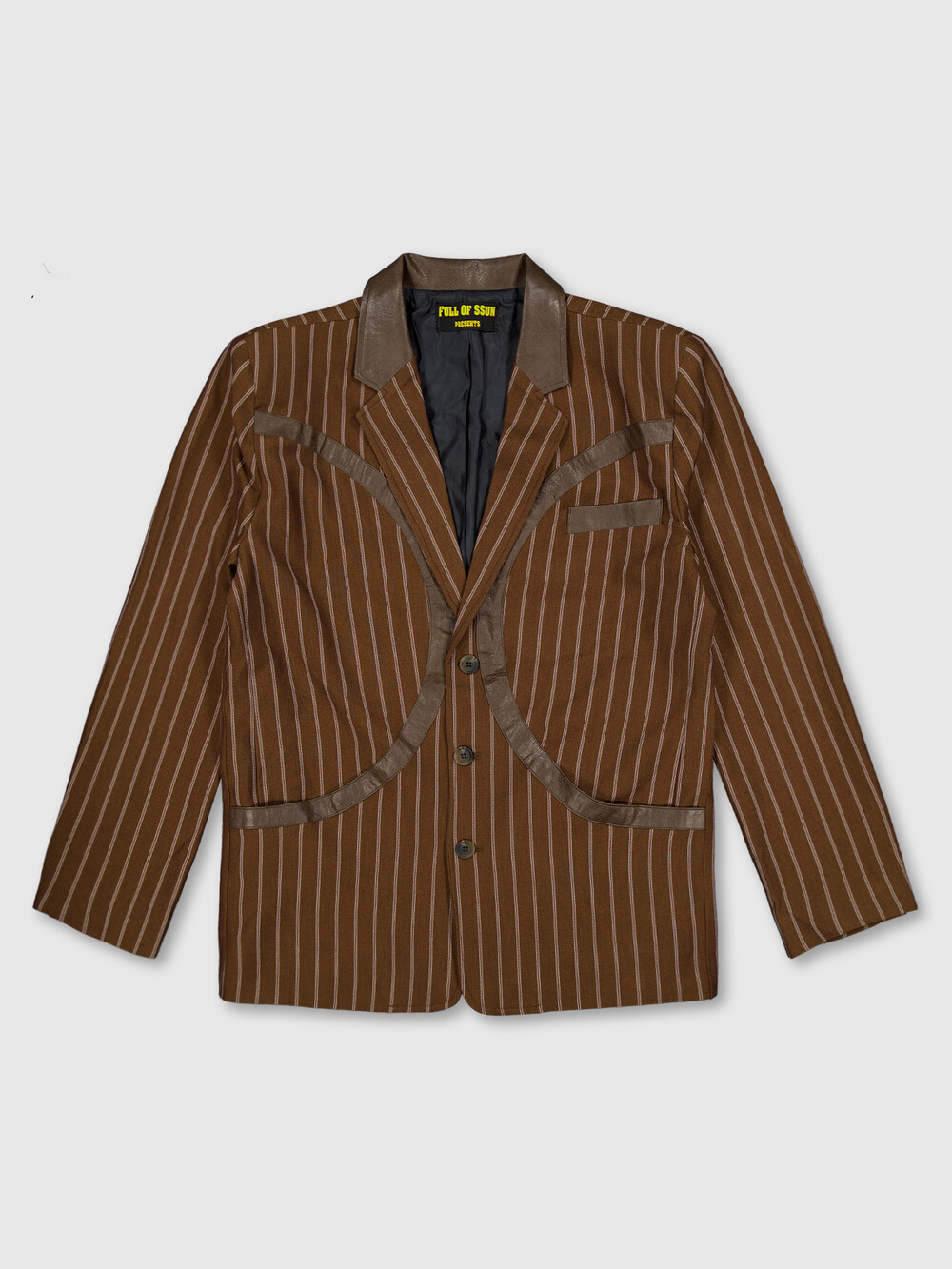 - FULLOFSSUN의 시그니쳐 써클 디테일이 레더패치로 들어간 스트라이프 원단의 블레이져 입니다.