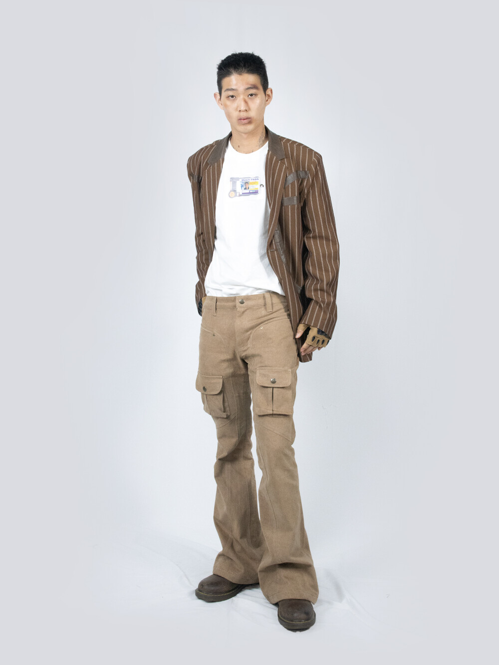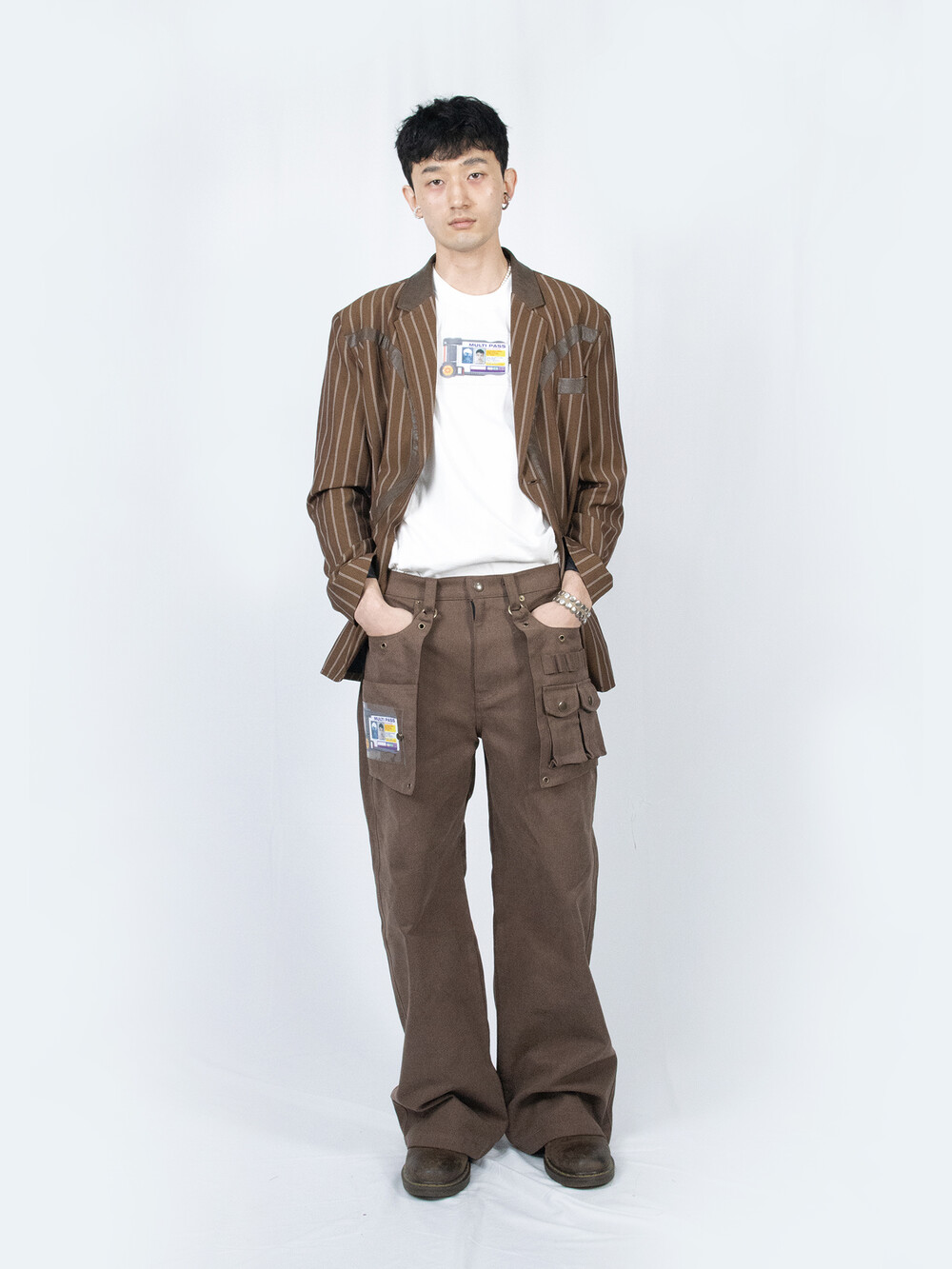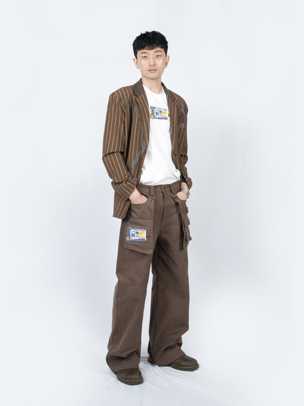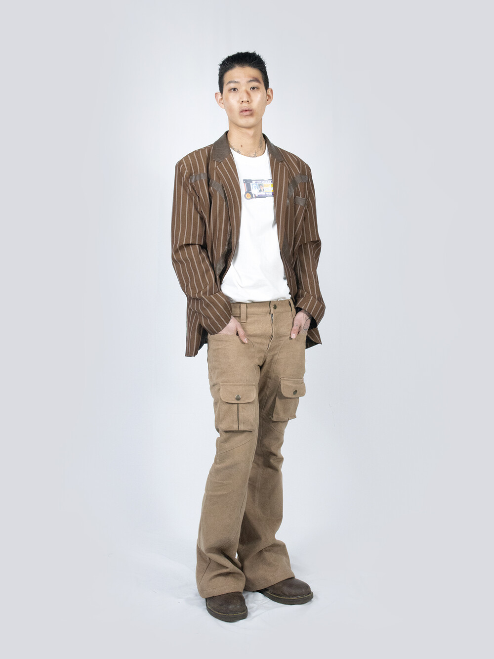 - FULLOFSSUN의 시그니쳐 써클 디테일이 레더패치로 들어간 스트라이프 원단의 블레이져 입니다.