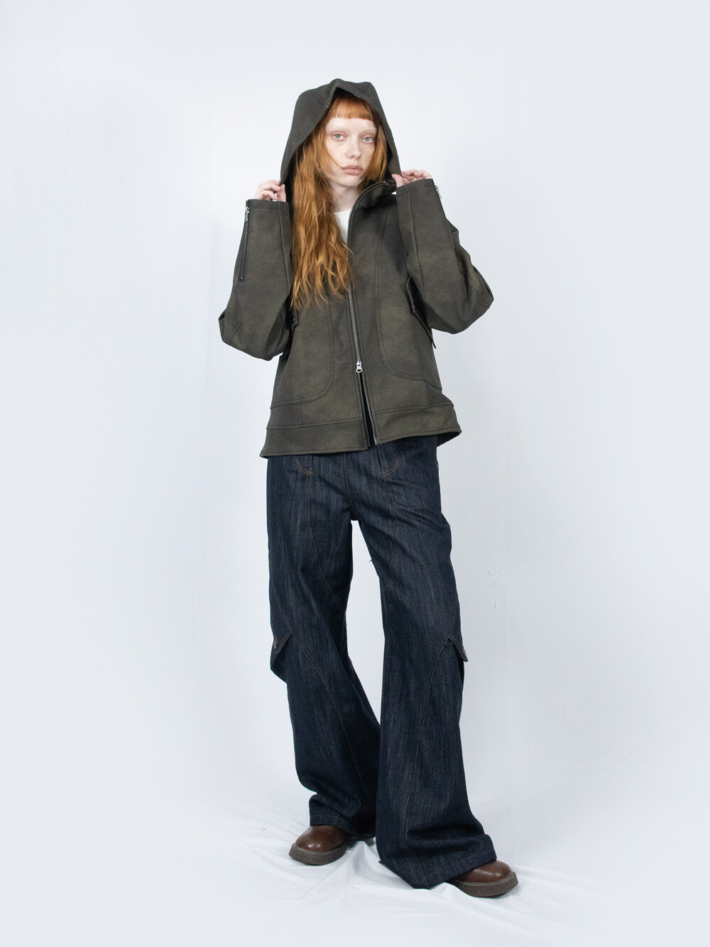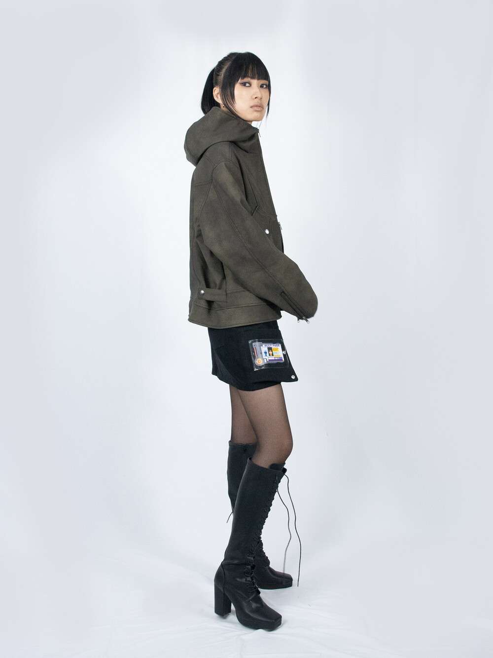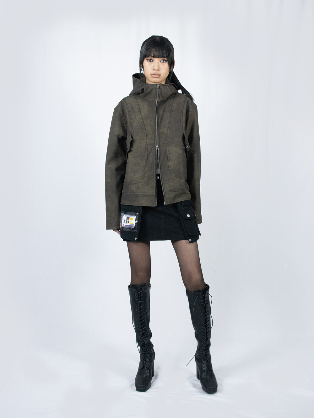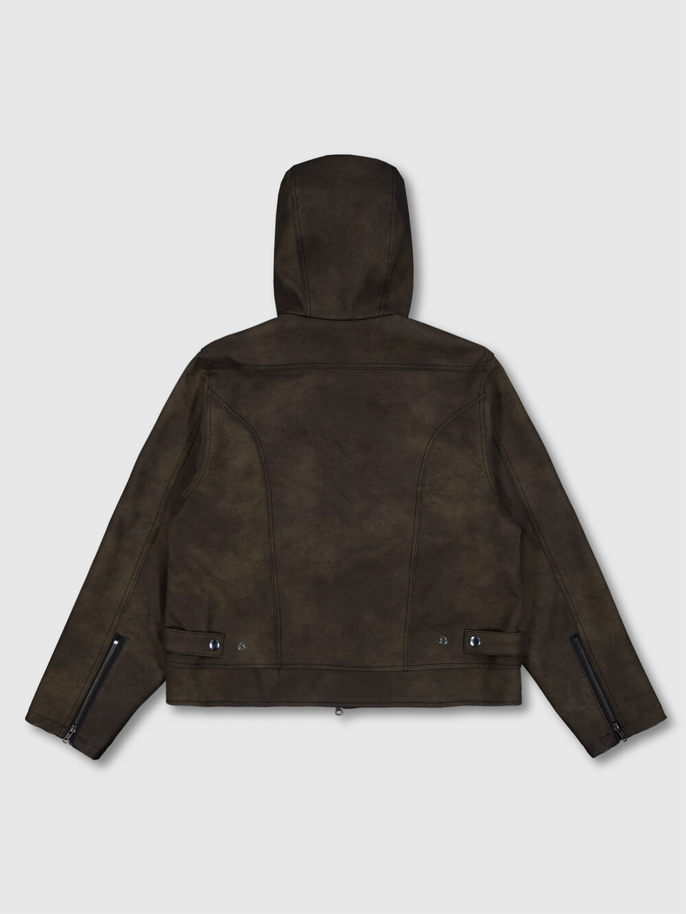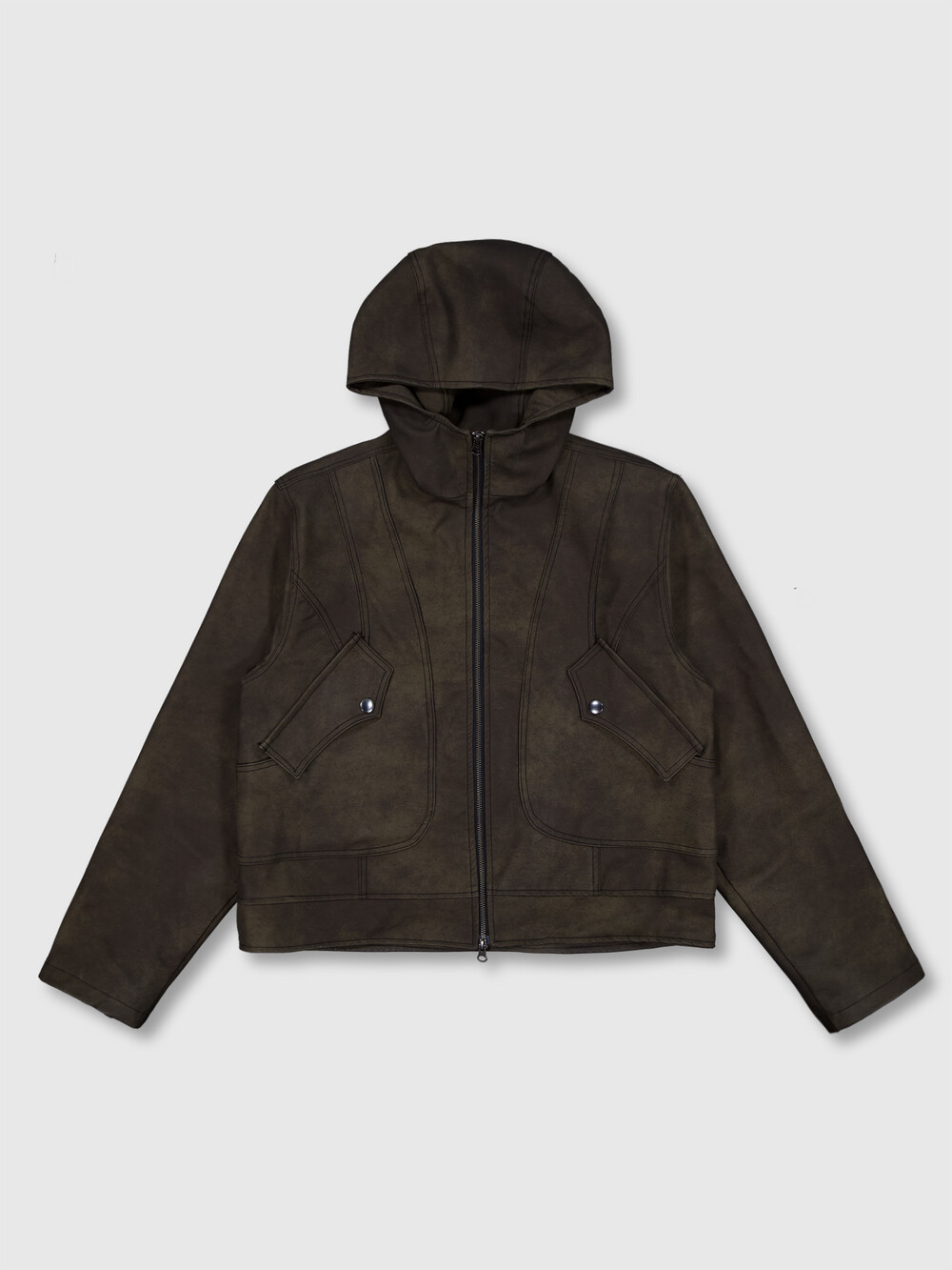 - Faux Leather 원단의 앞판 커브디테일이 들어간 후드 레더자켓 입니다.