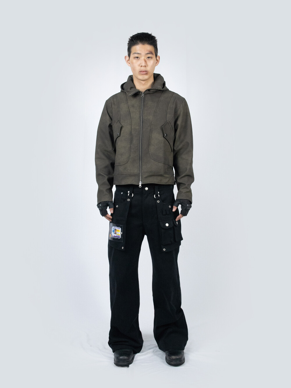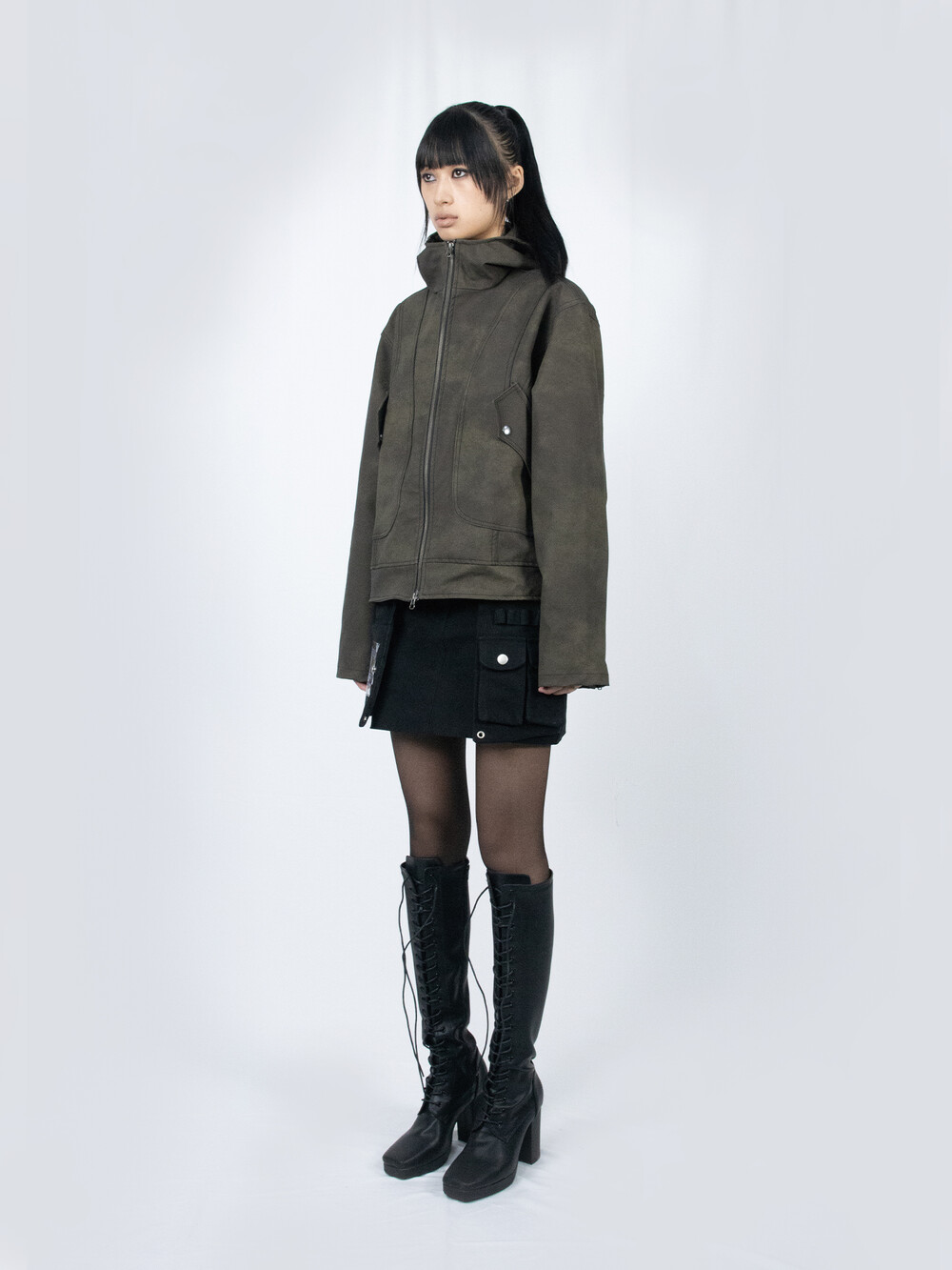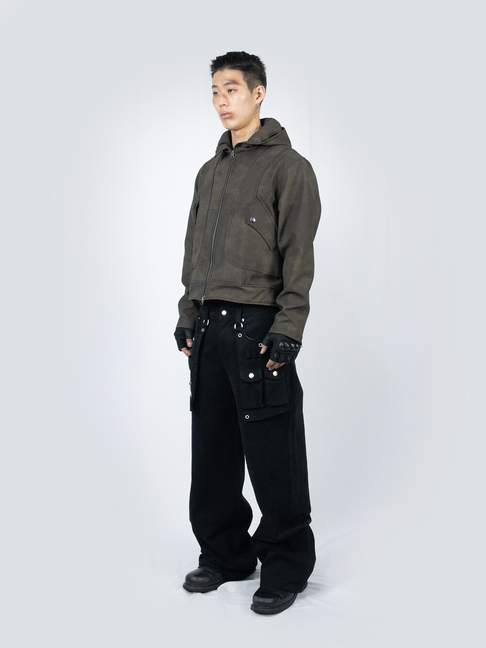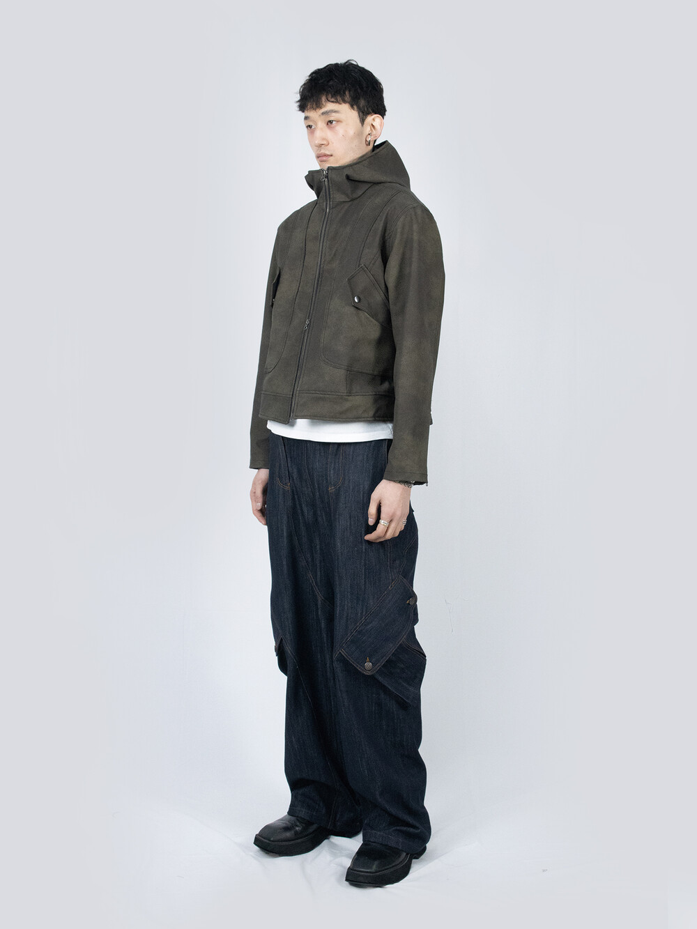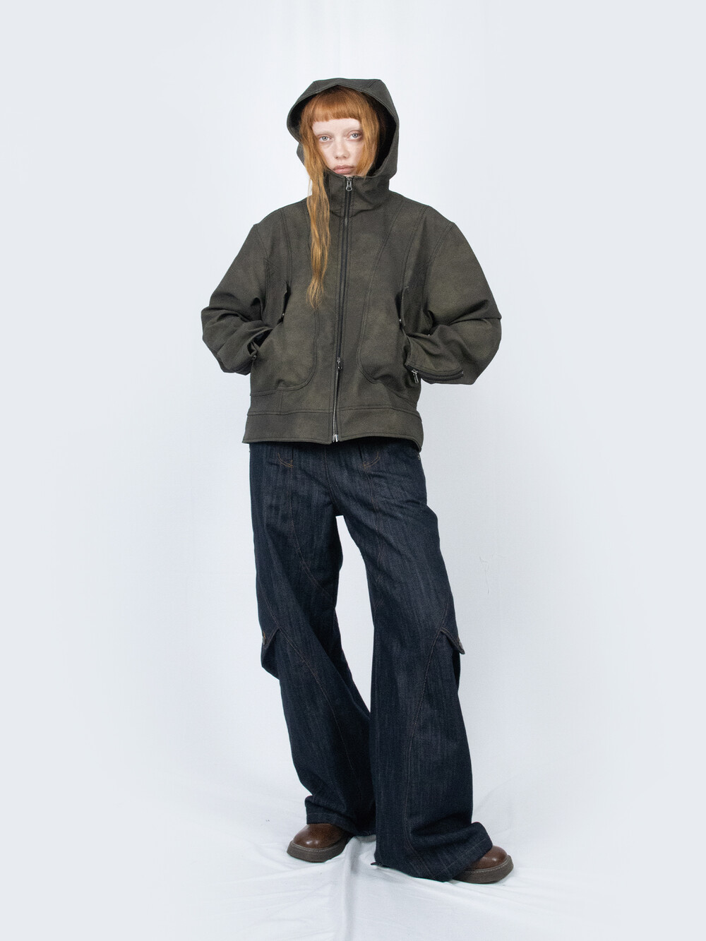 - Faux Leather 원단의 앞판 커브디테일이 들어간 후드 레더자켓 입니다.