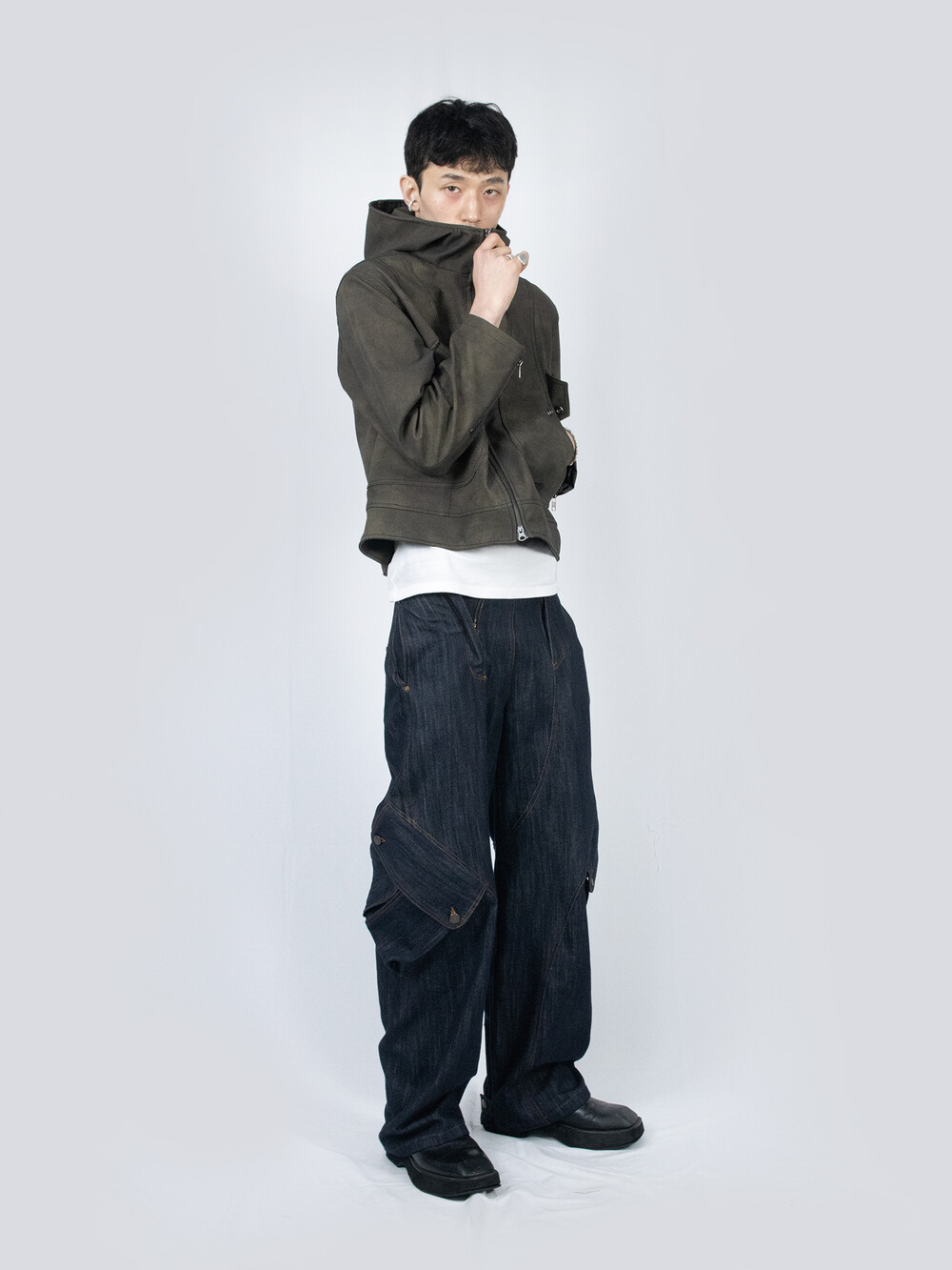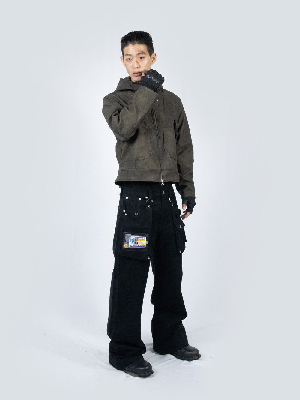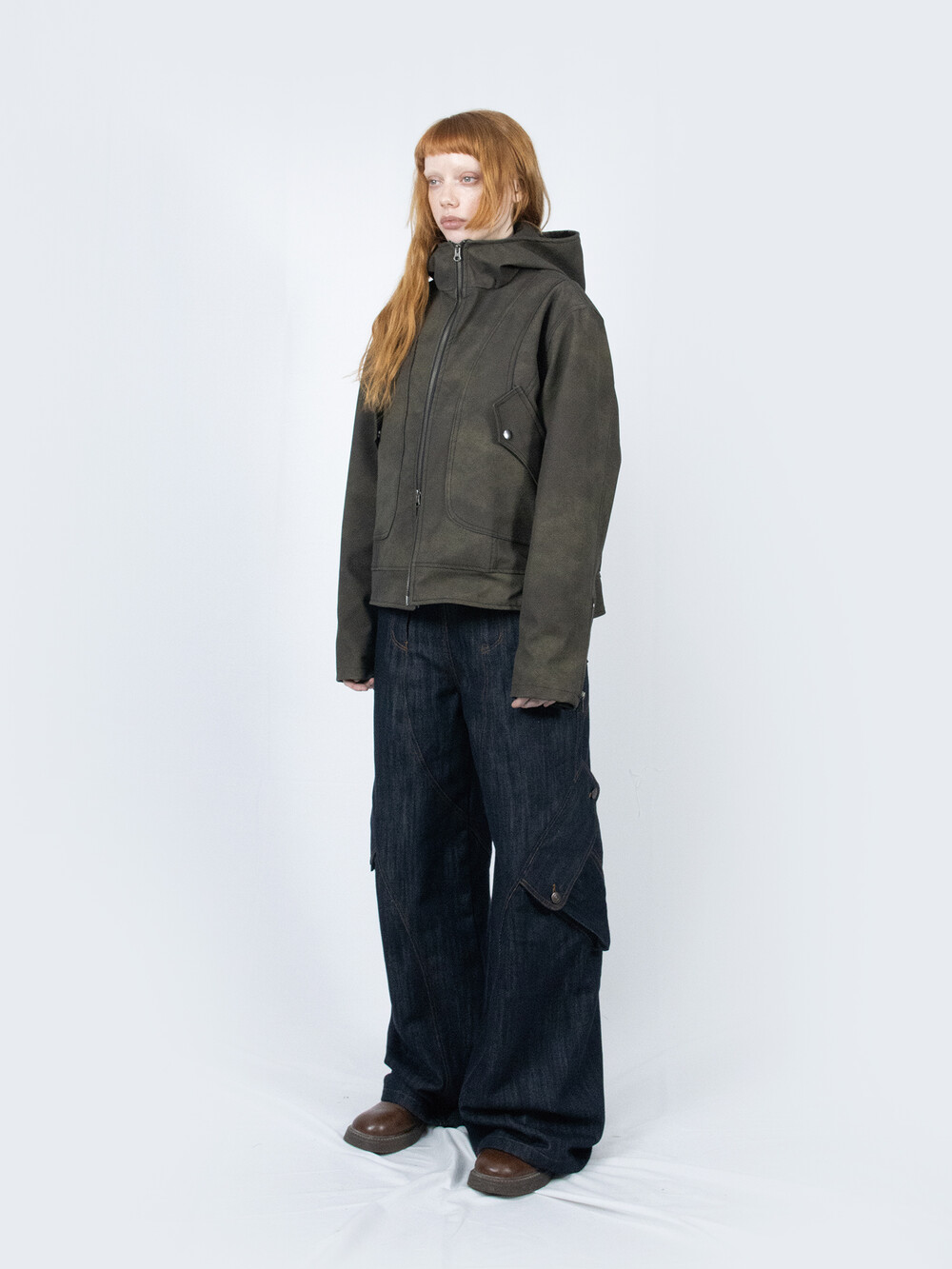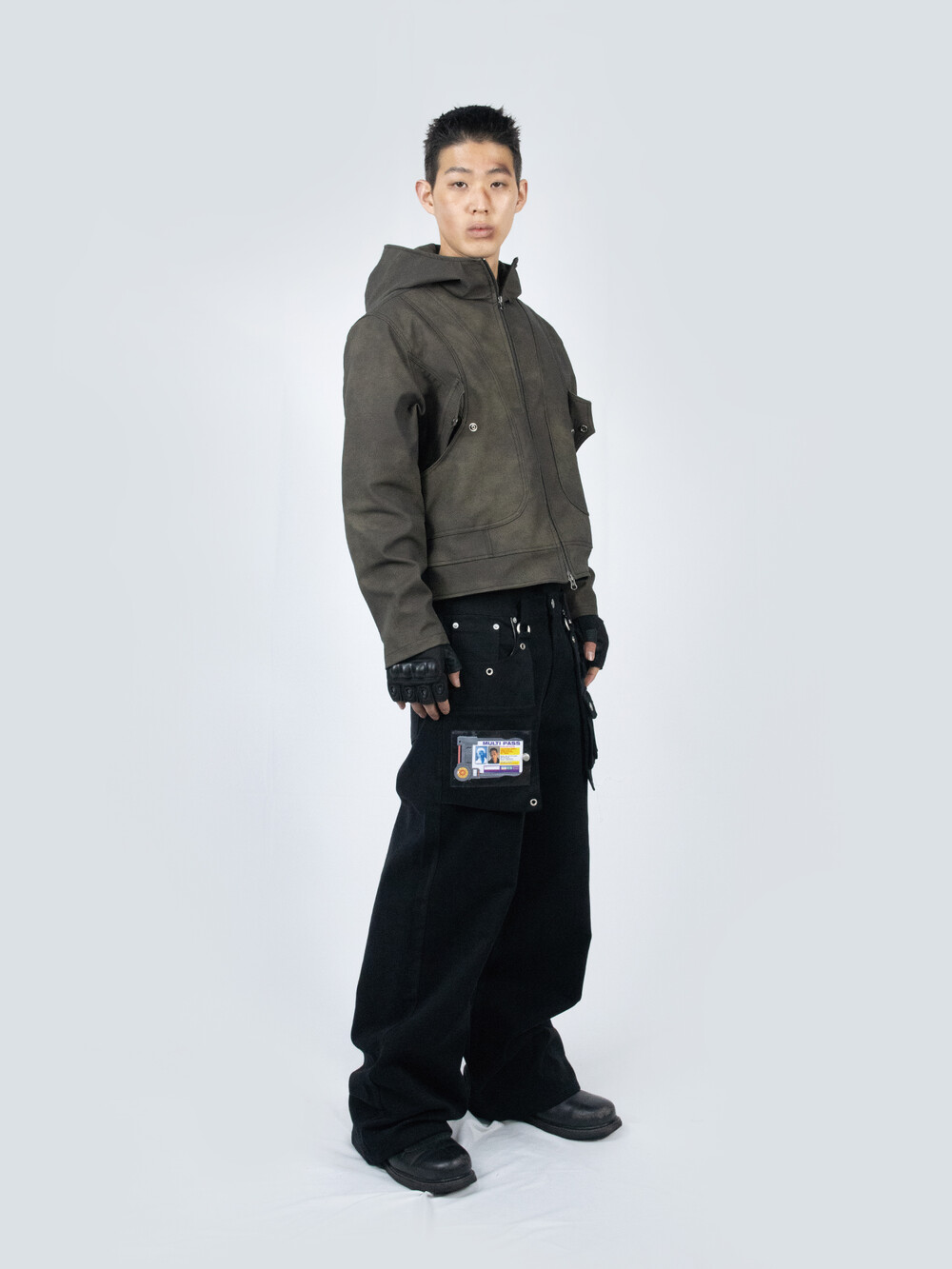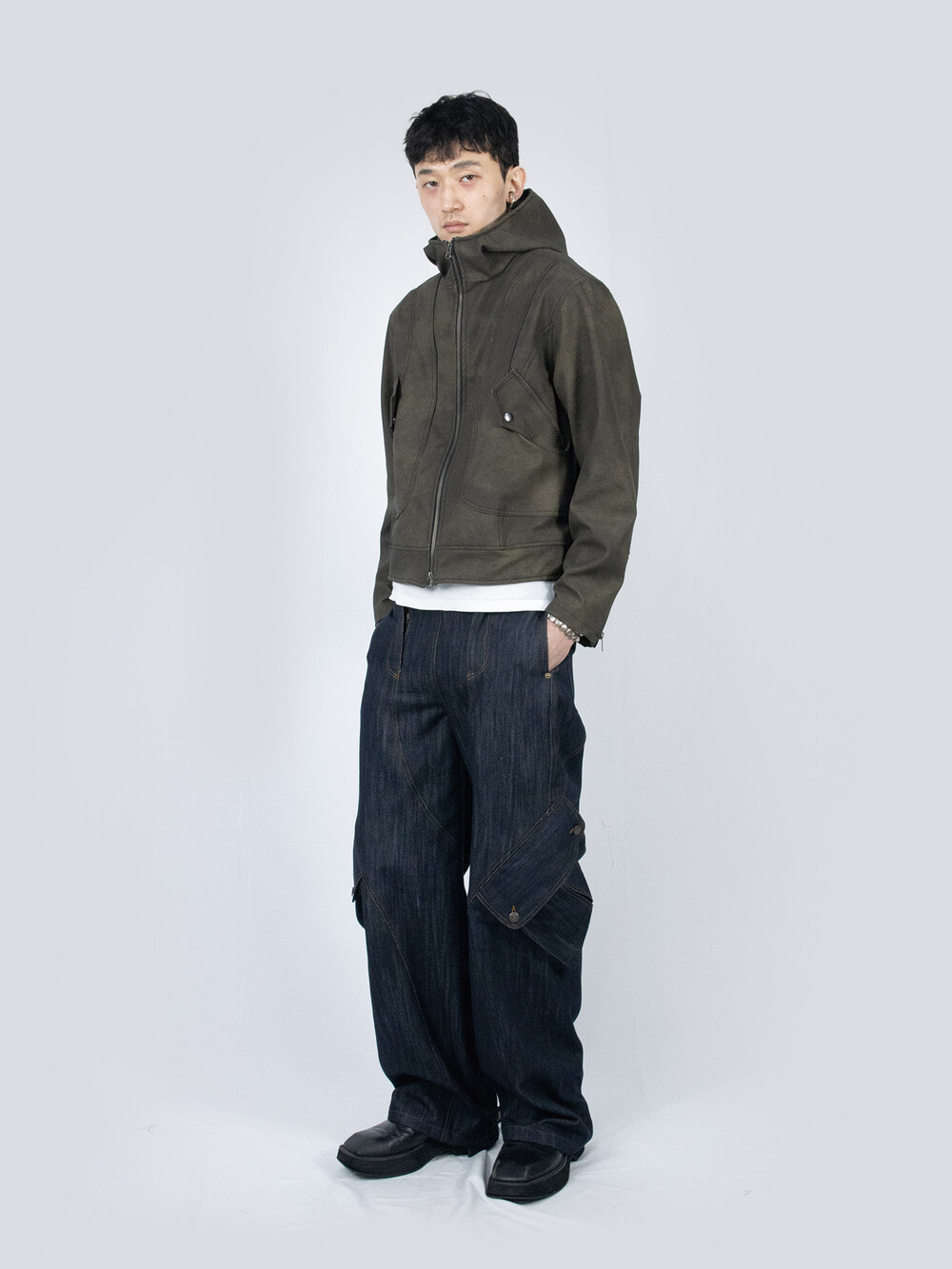 - Faux Leather 원단의 앞판 커브디테일이 들어간 후드 레더자켓 입니다.