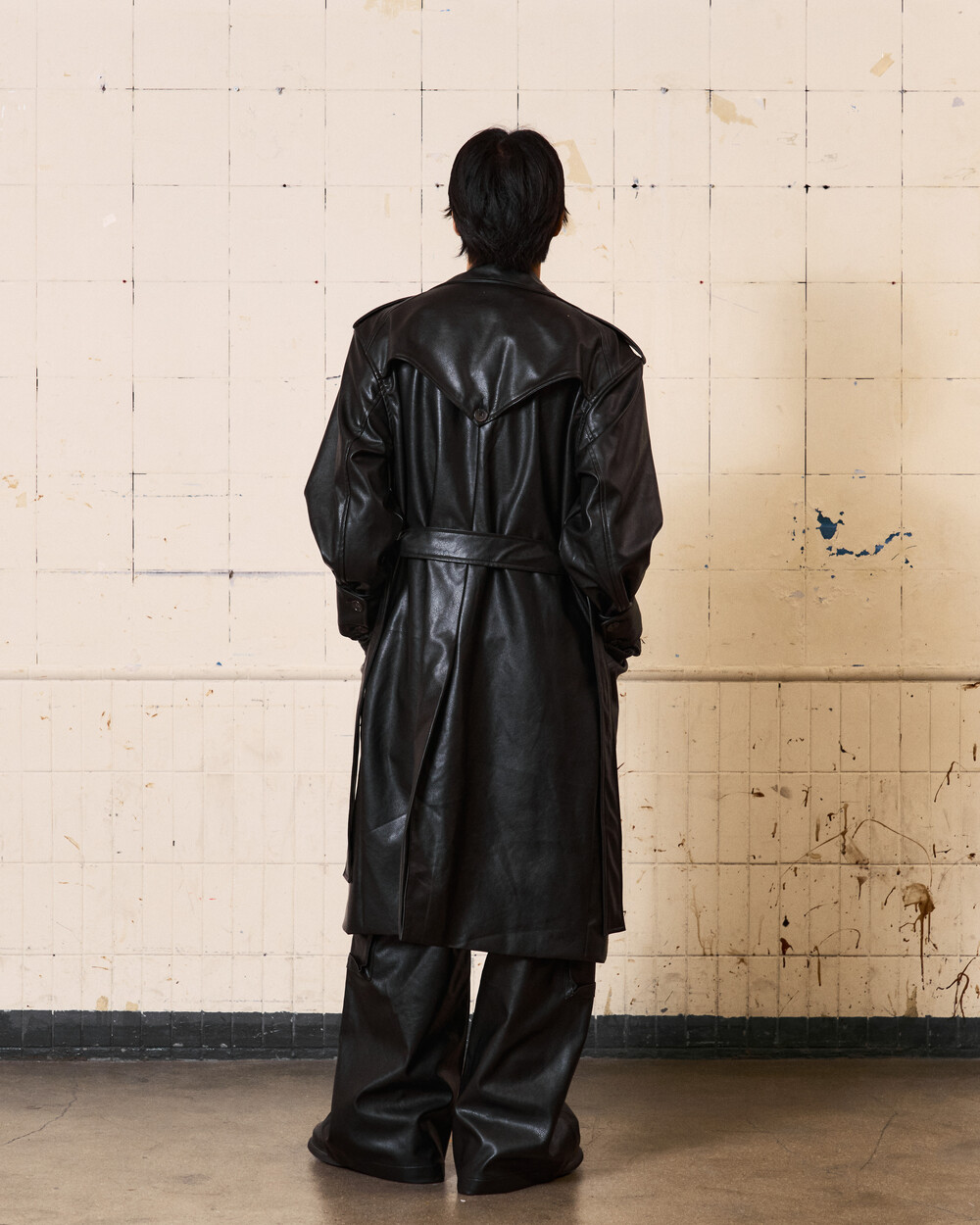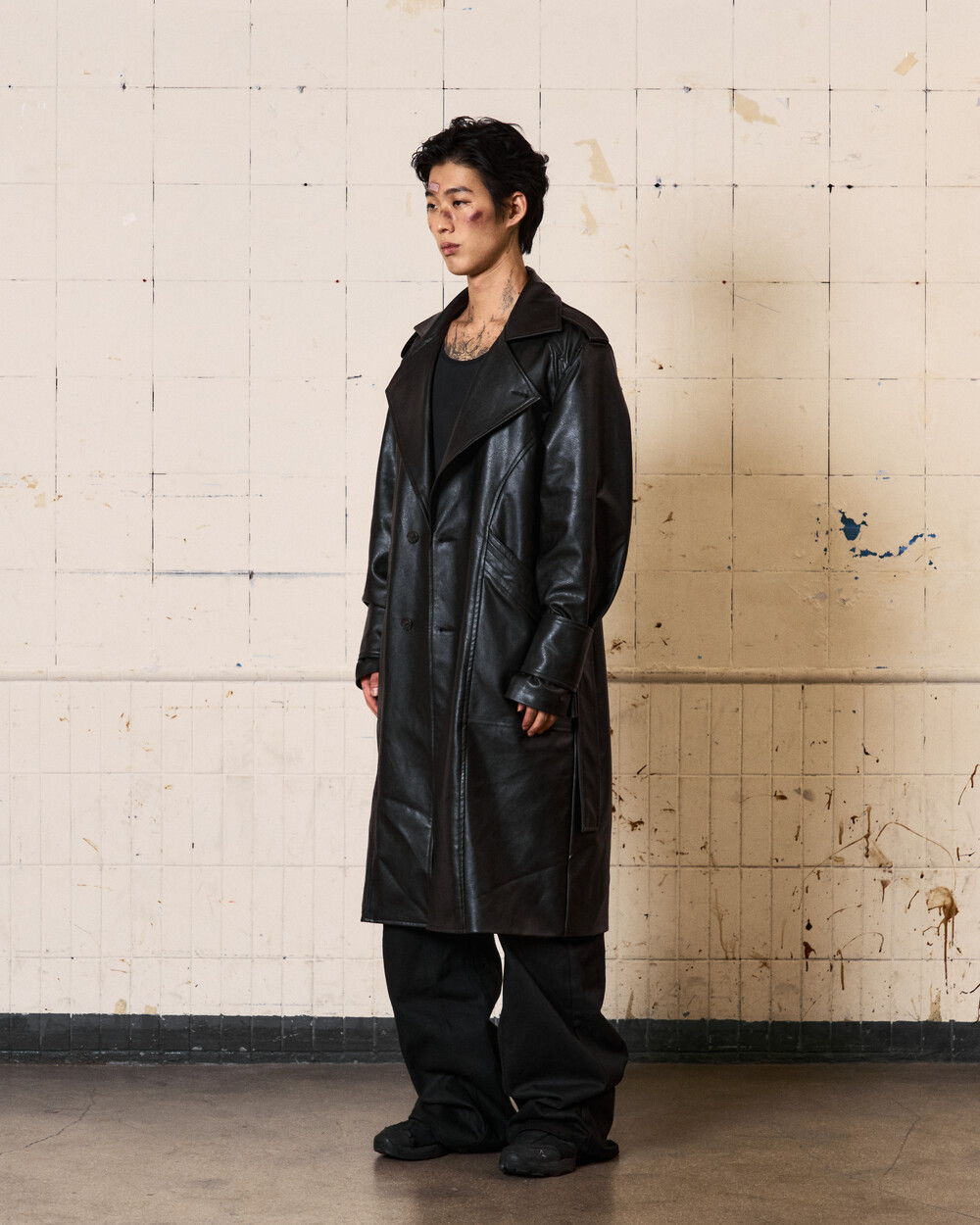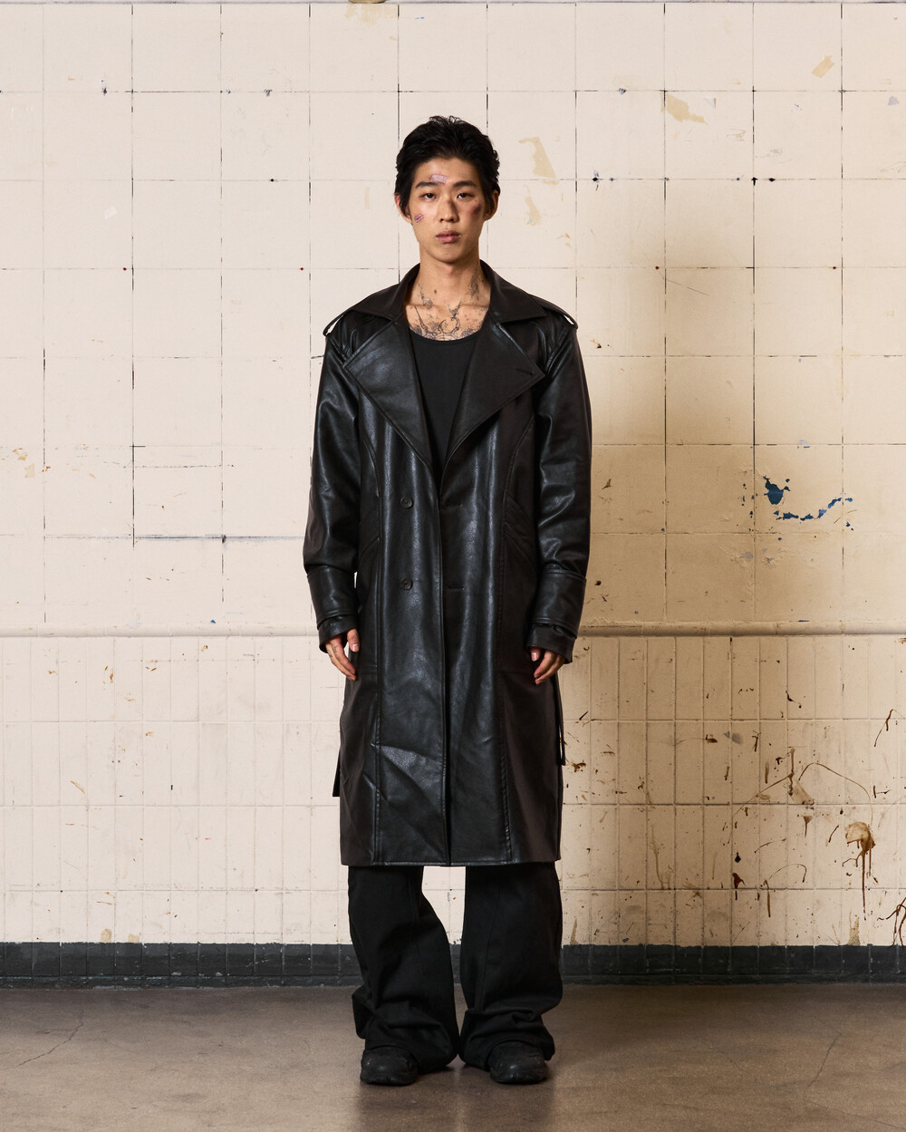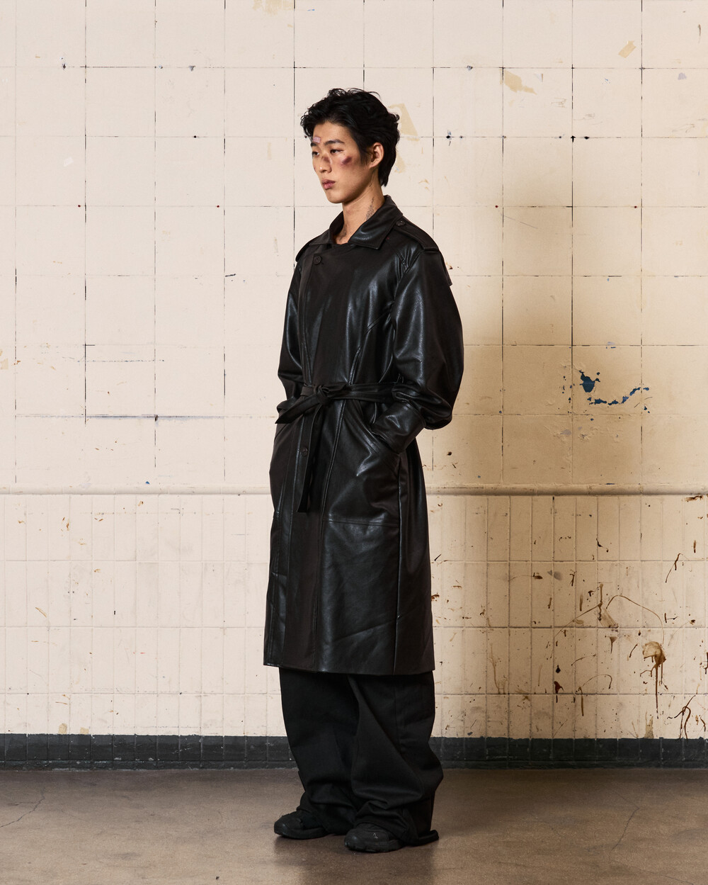 - Faux Leather 원단의 앞판 커브디테일이 들어간 레더코트 입니다.