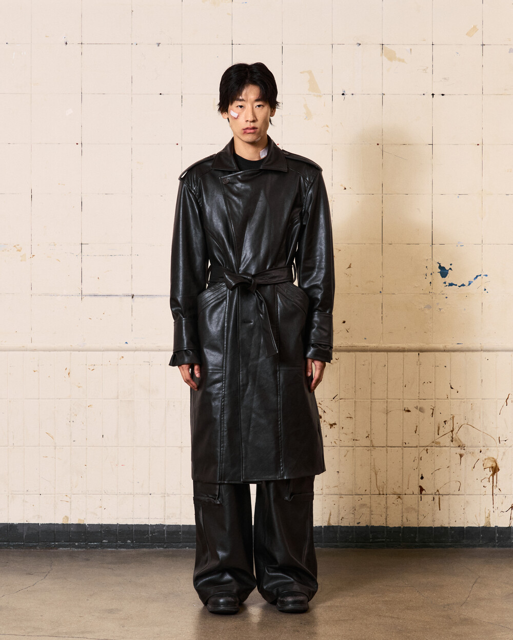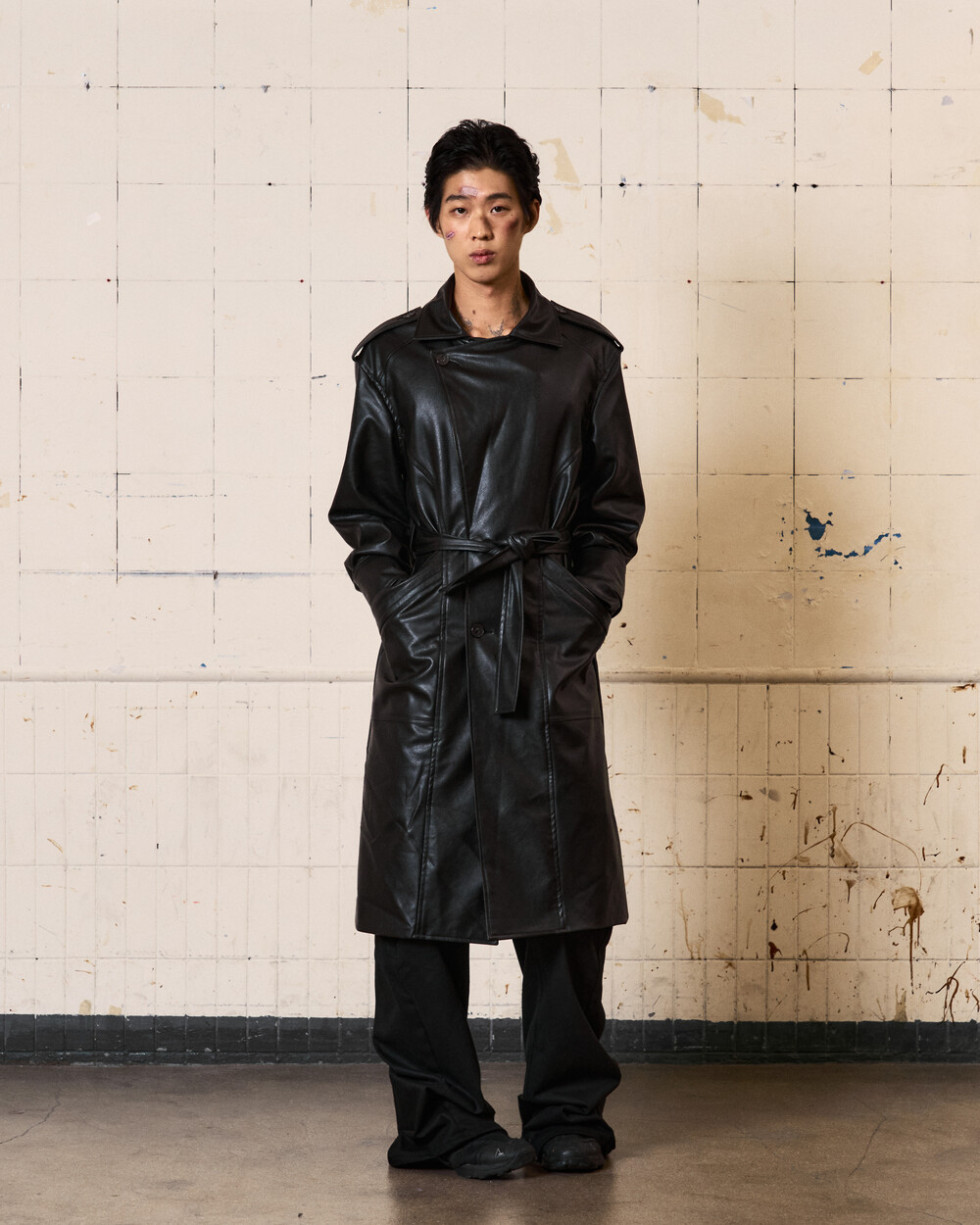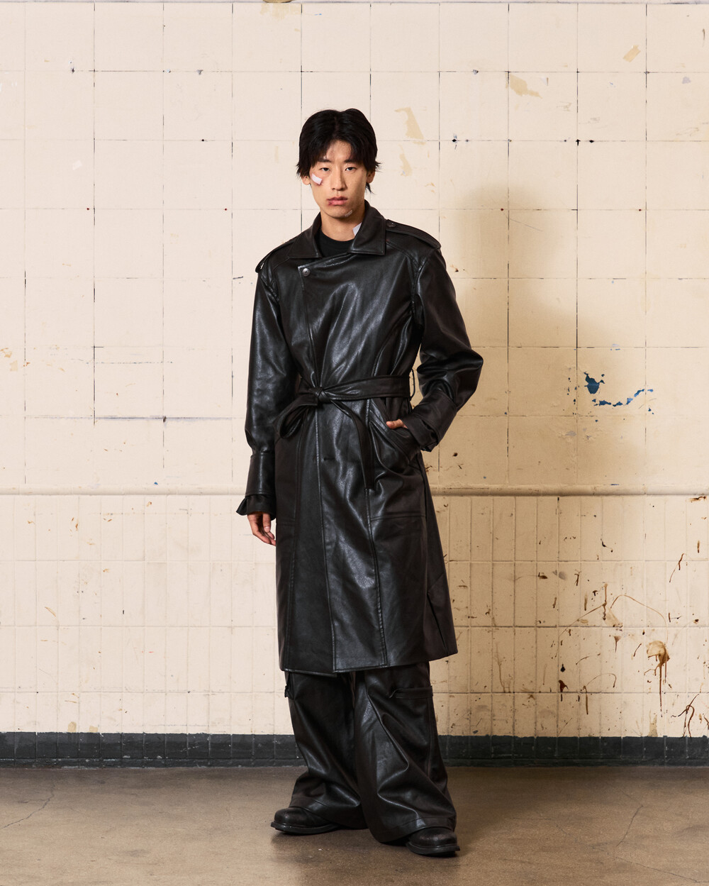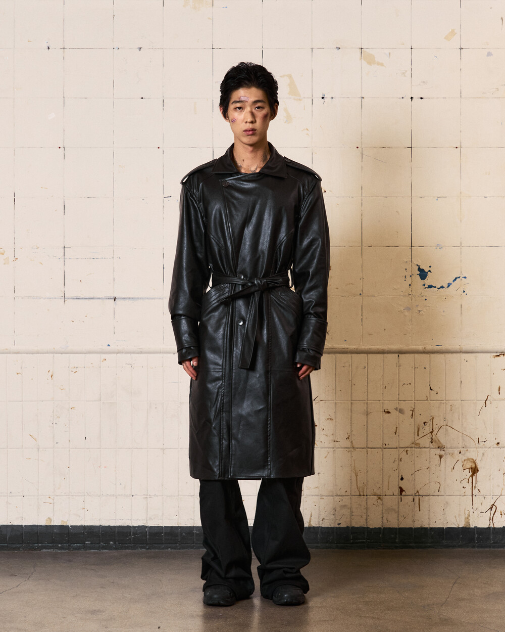 - Faux Leather 원단의 앞판 커브디테일이 들어간 레더코트 입니다.