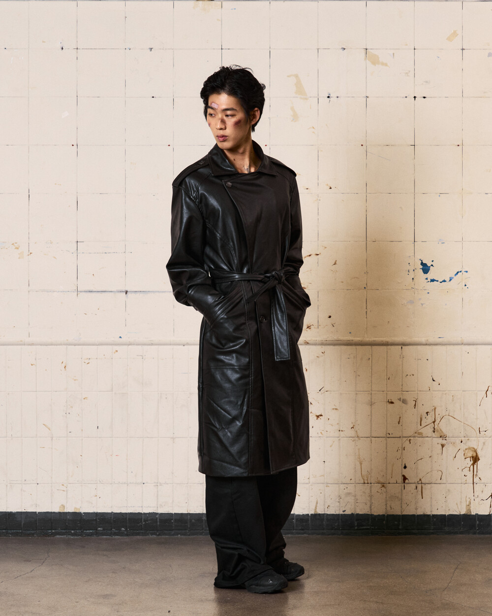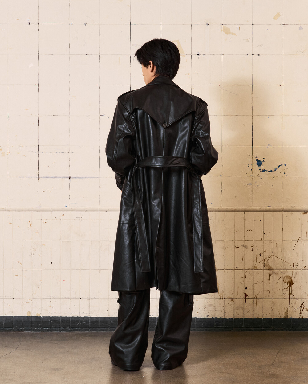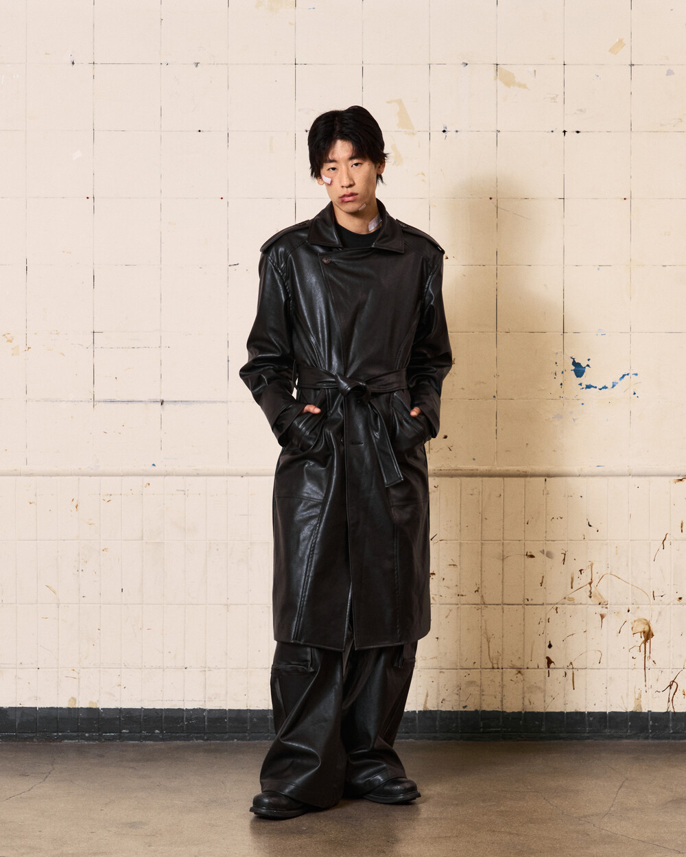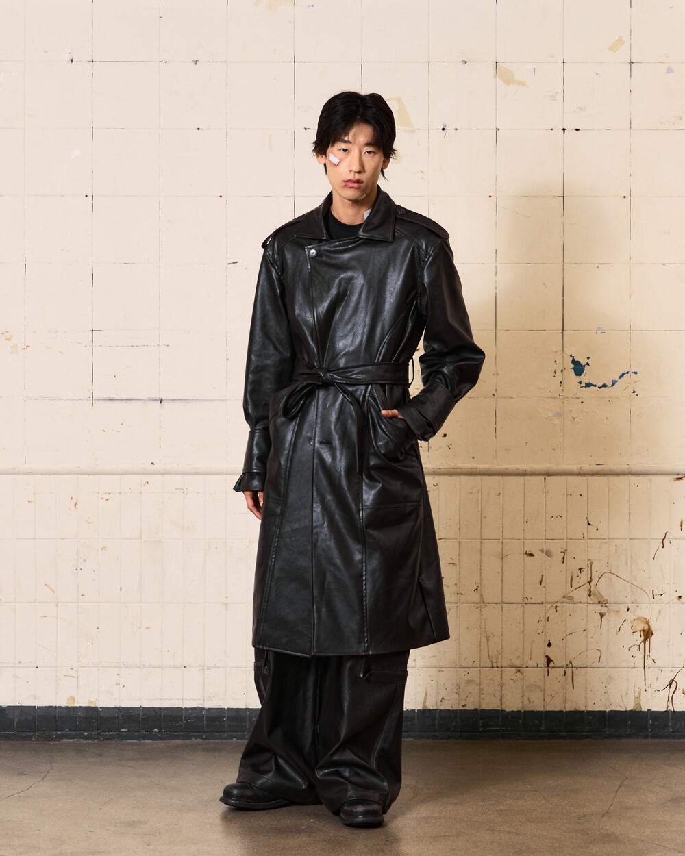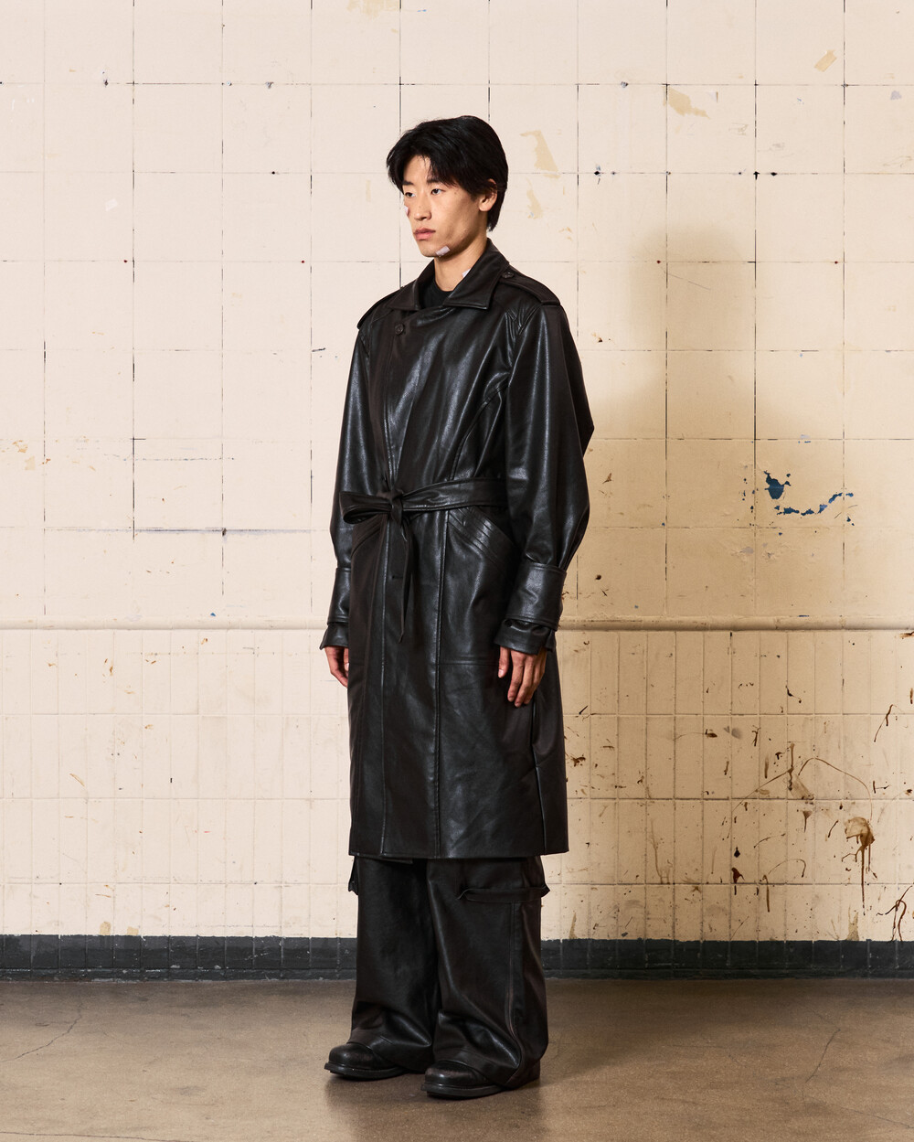 - Faux Leather 원단의 앞판 커브디테일이 들어간 레더코트 입니다.