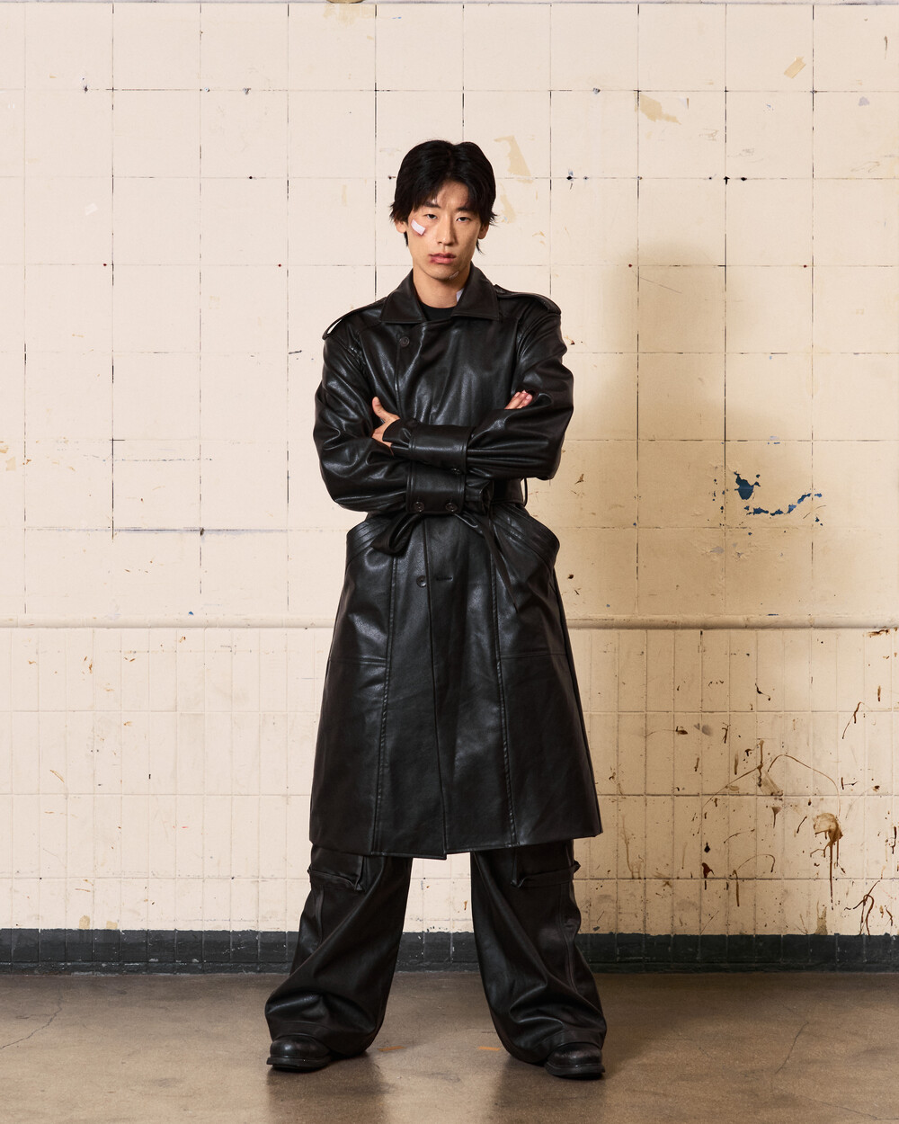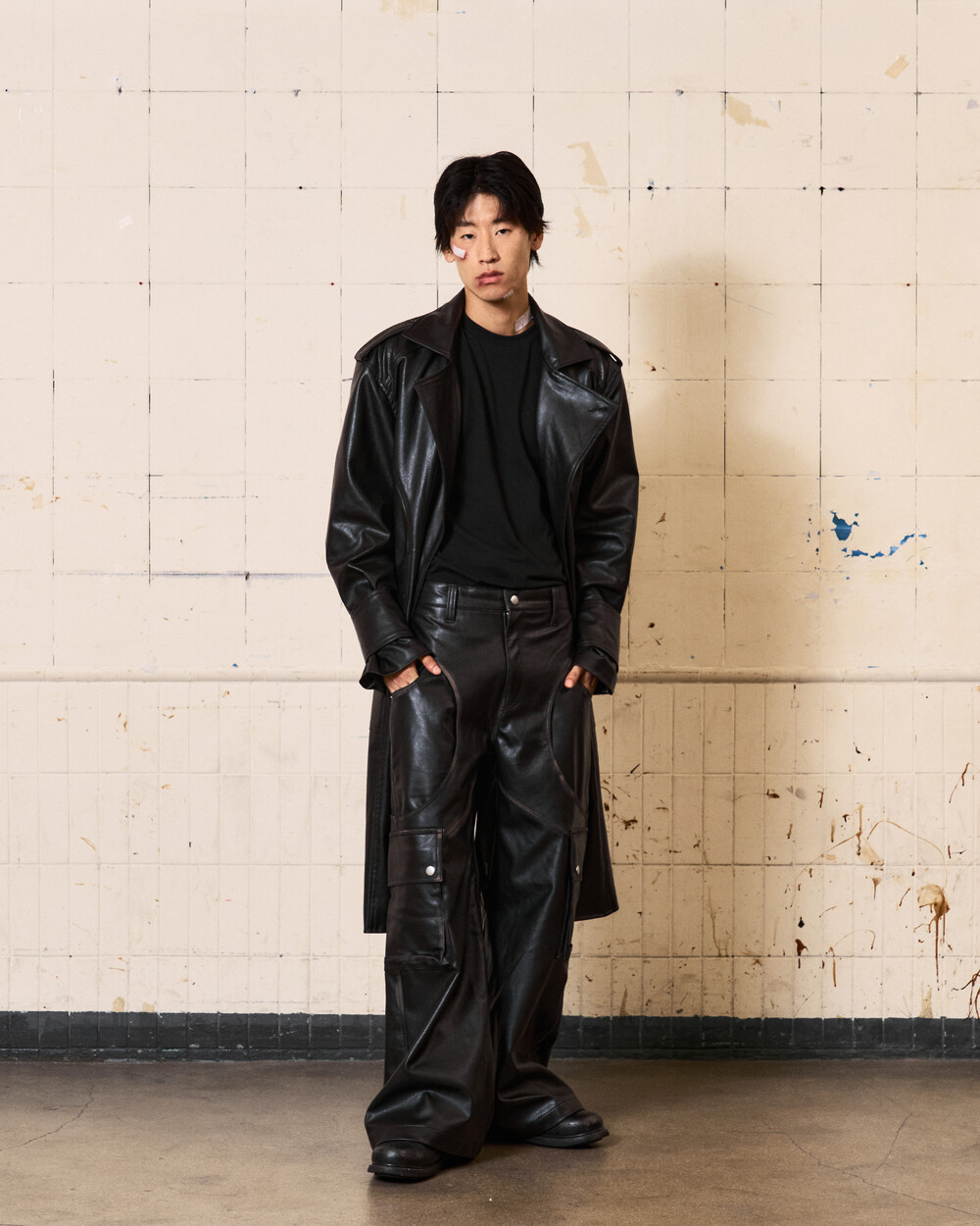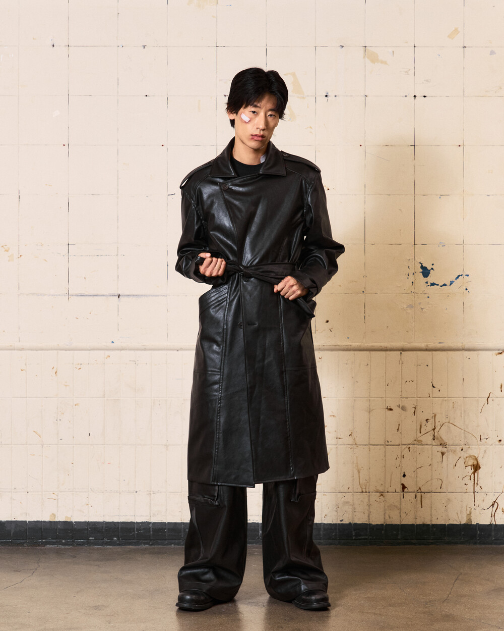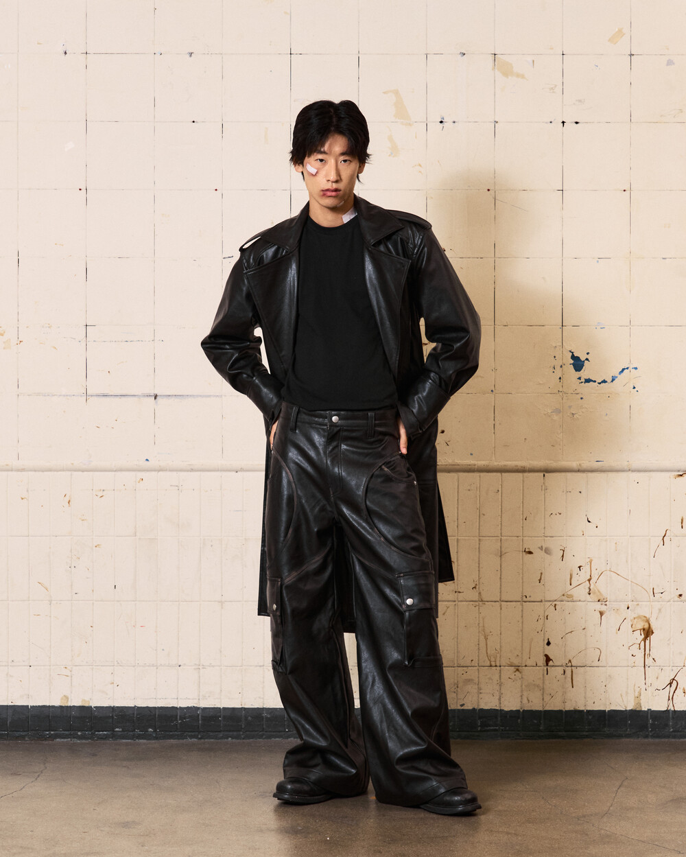 - Faux Leather 원단의 앞판 커브디테일이 들어간 레더코트 입니다.
