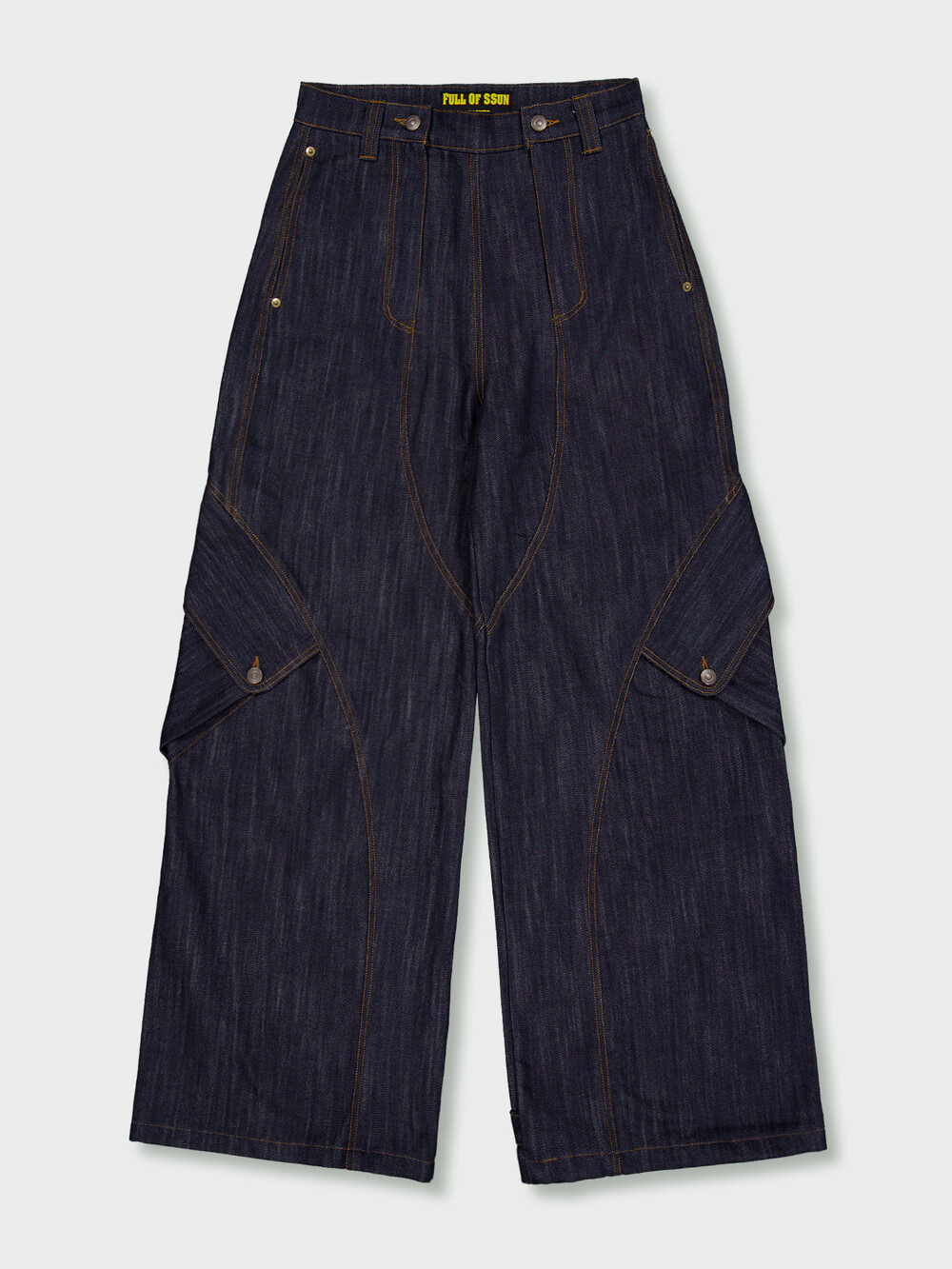 - 지퍼플라이(뎅고)를 양쪽에 더블로 배치한 디테일의 와이드핏 카고데님입니다.