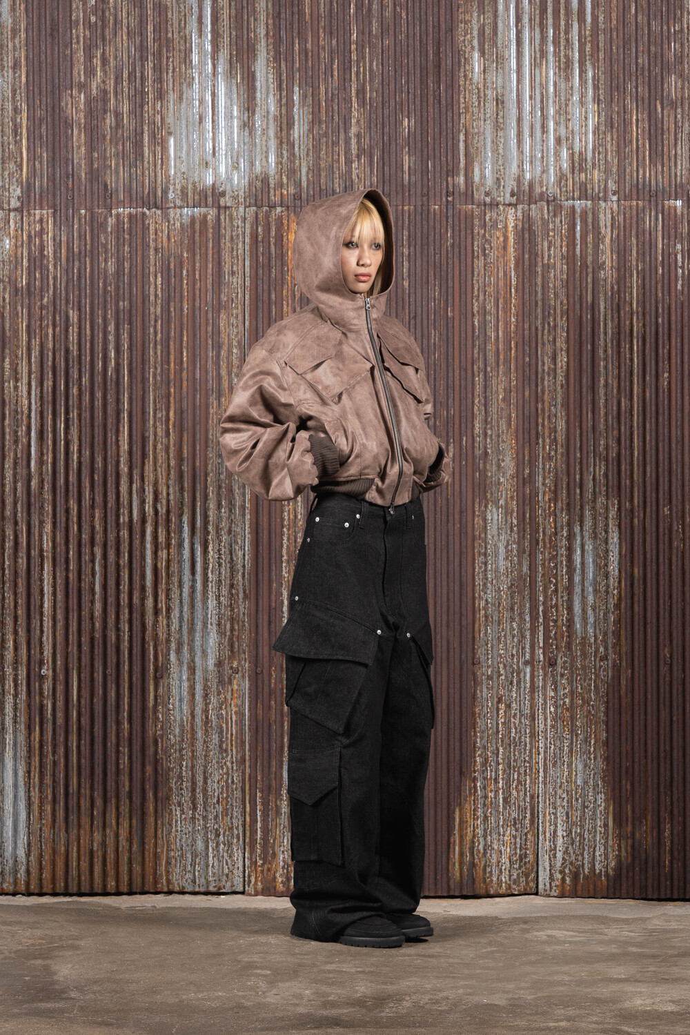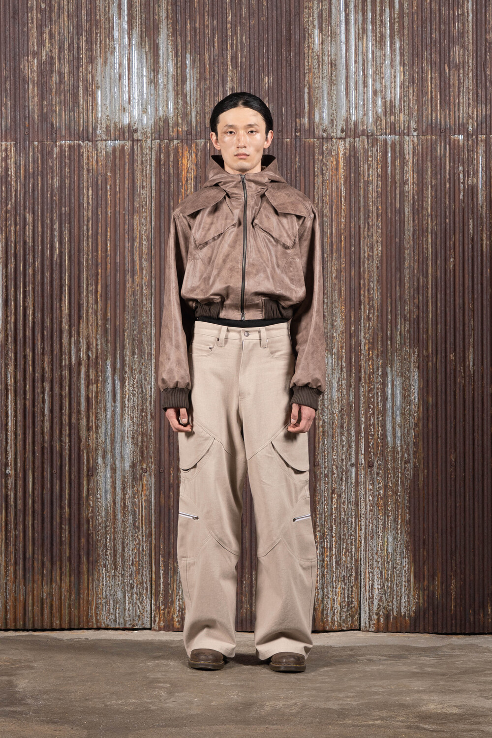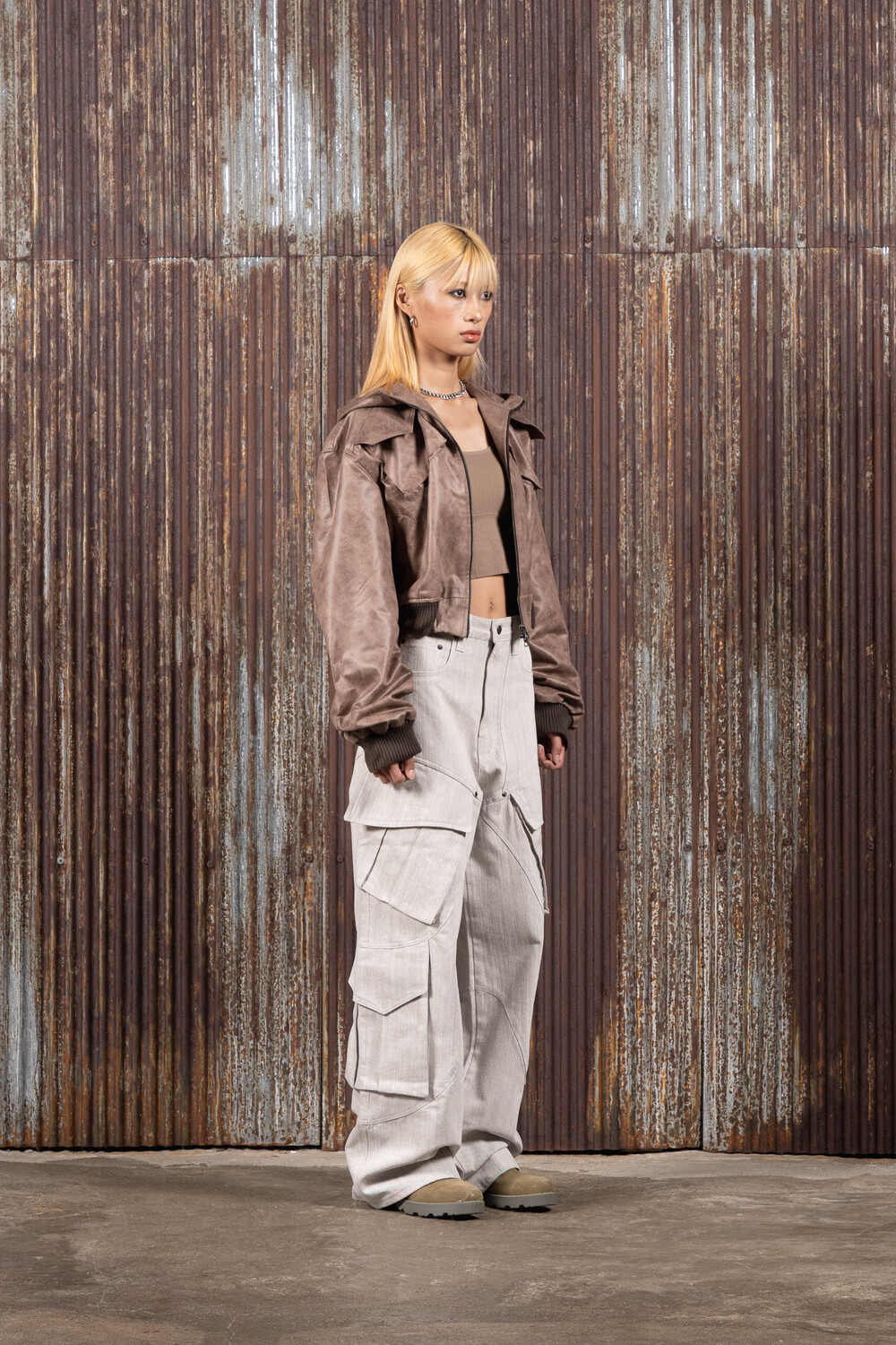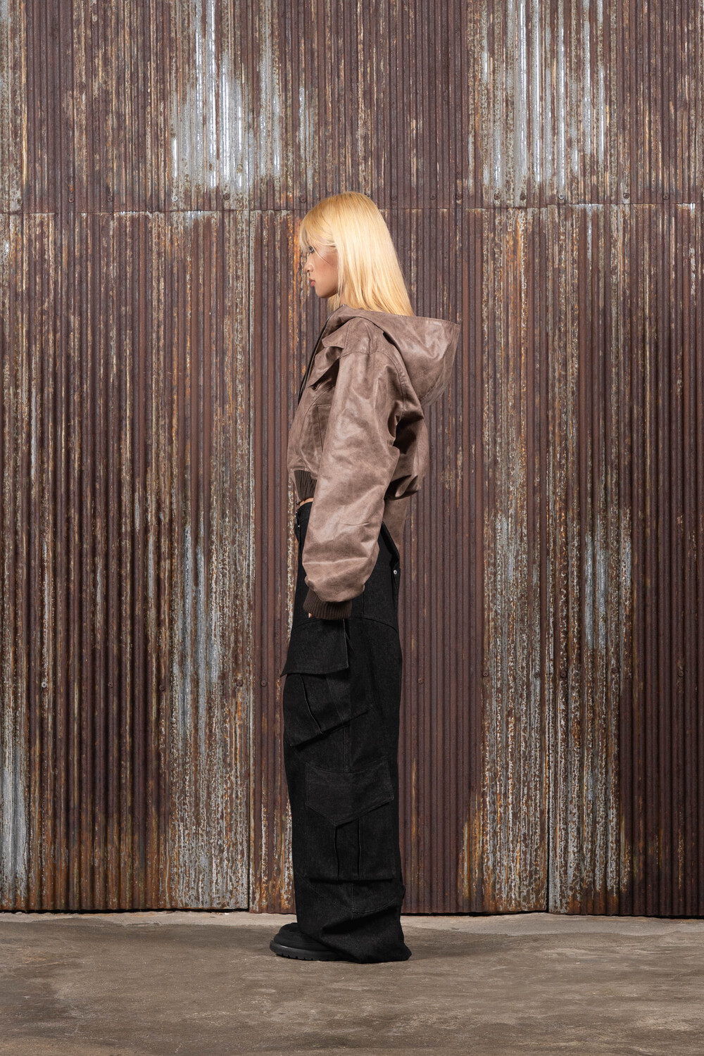 Hood Cargo Crop Leather Jacket (Brown)