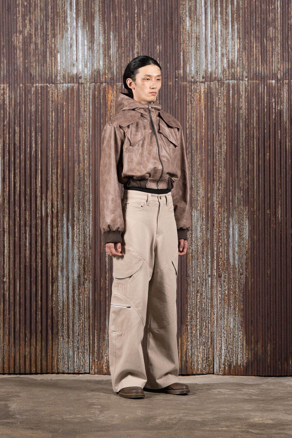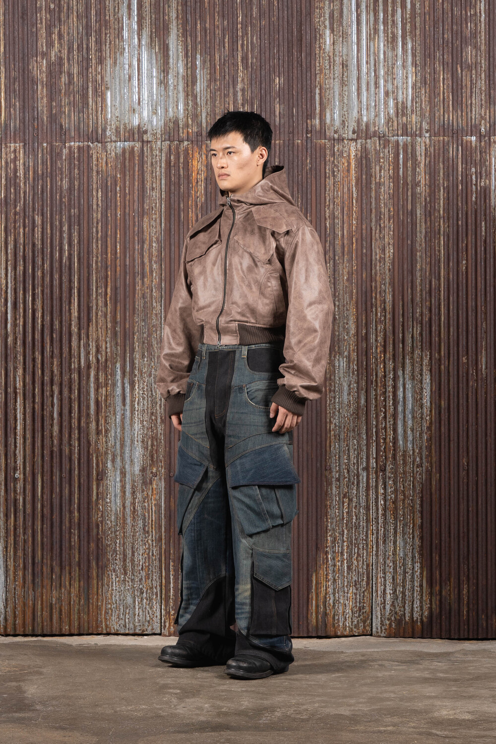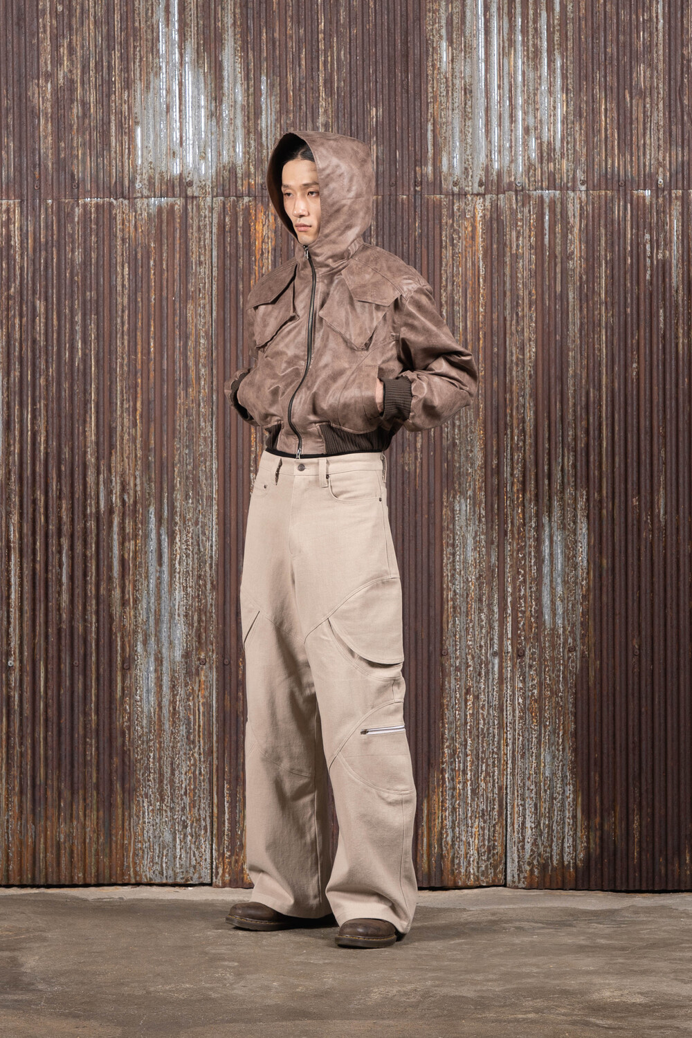 Hood Cargo Crop Leather Jacket (Brown)