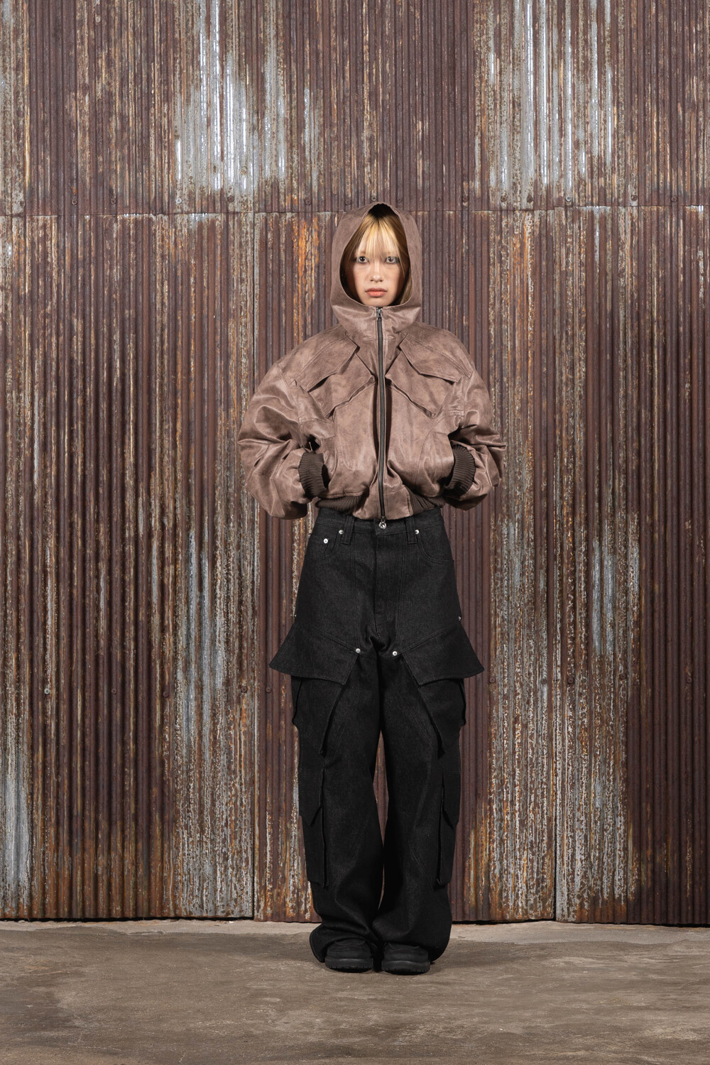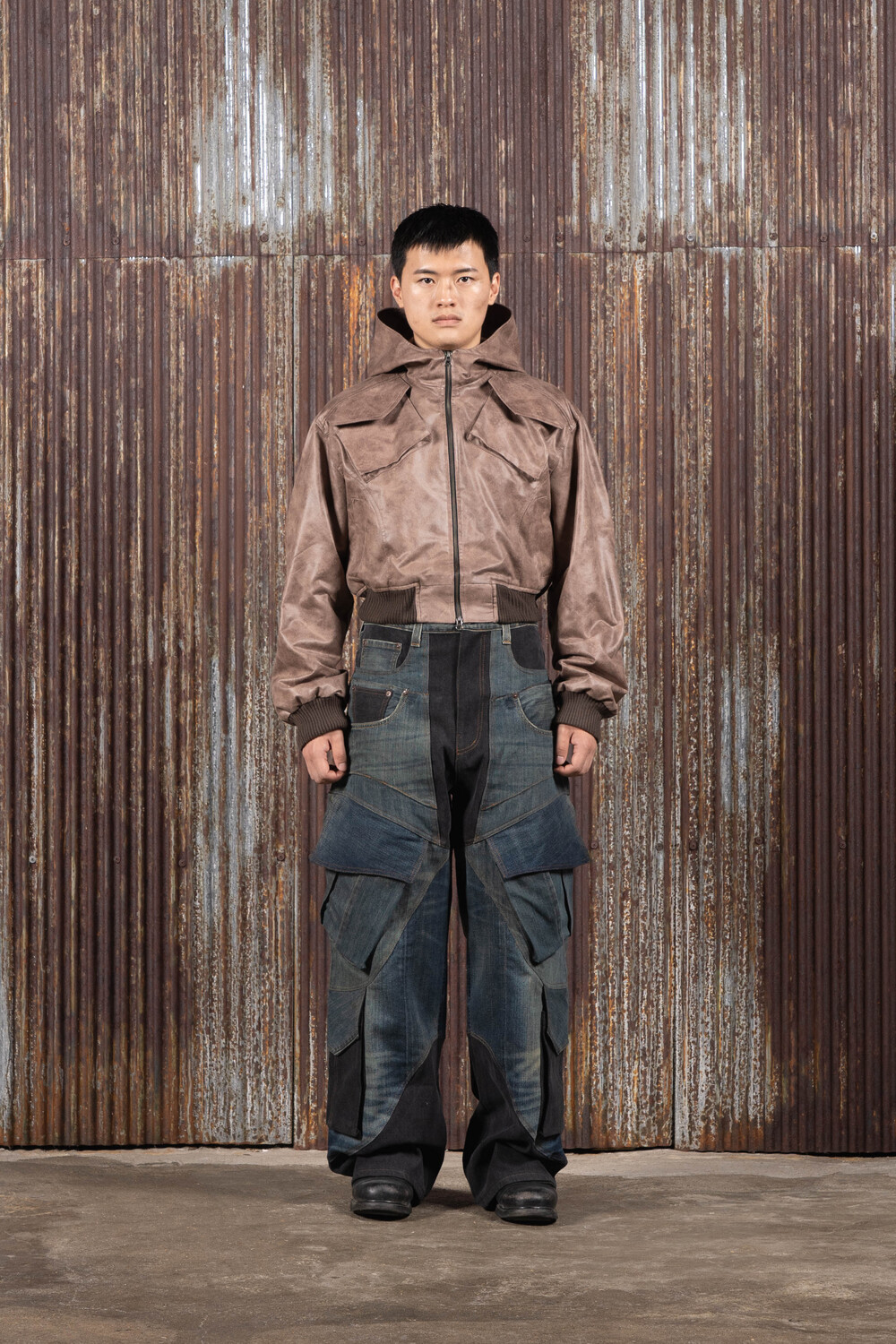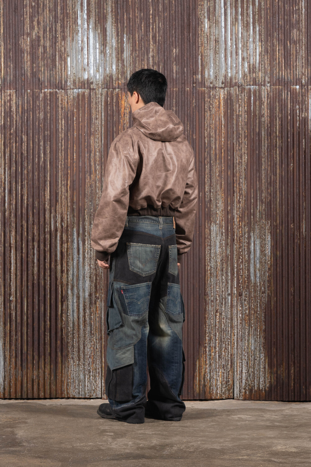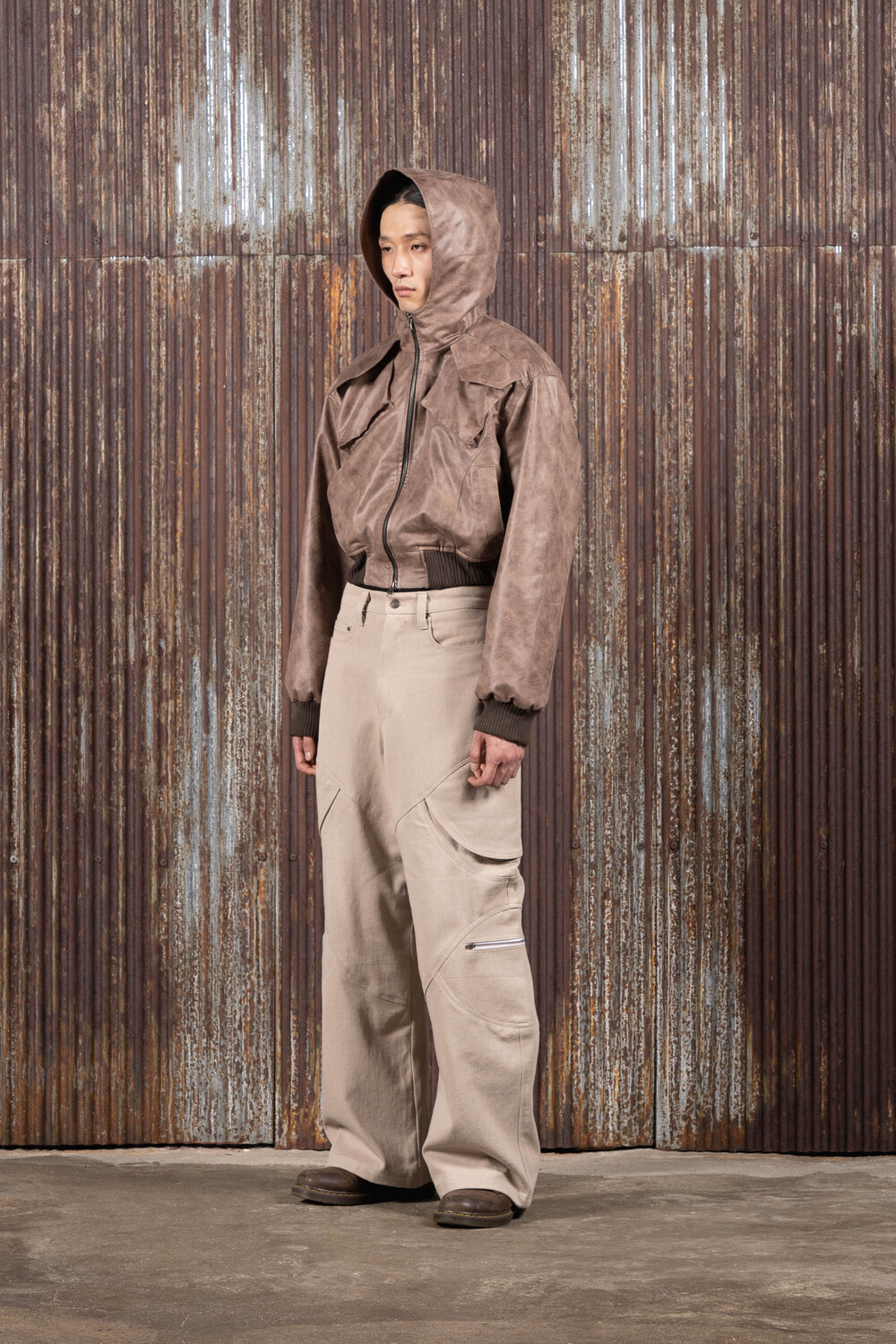 Hood Cargo Crop Leather Jacket (Brown)