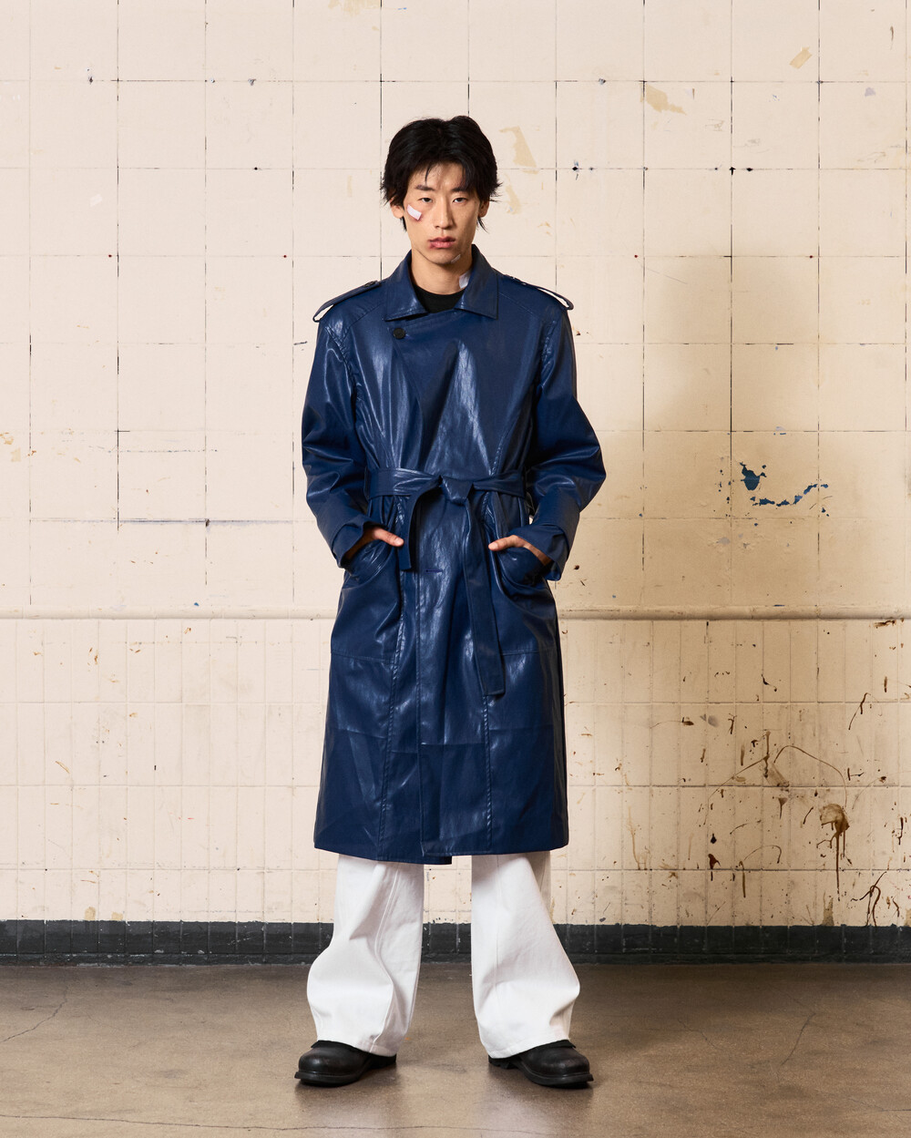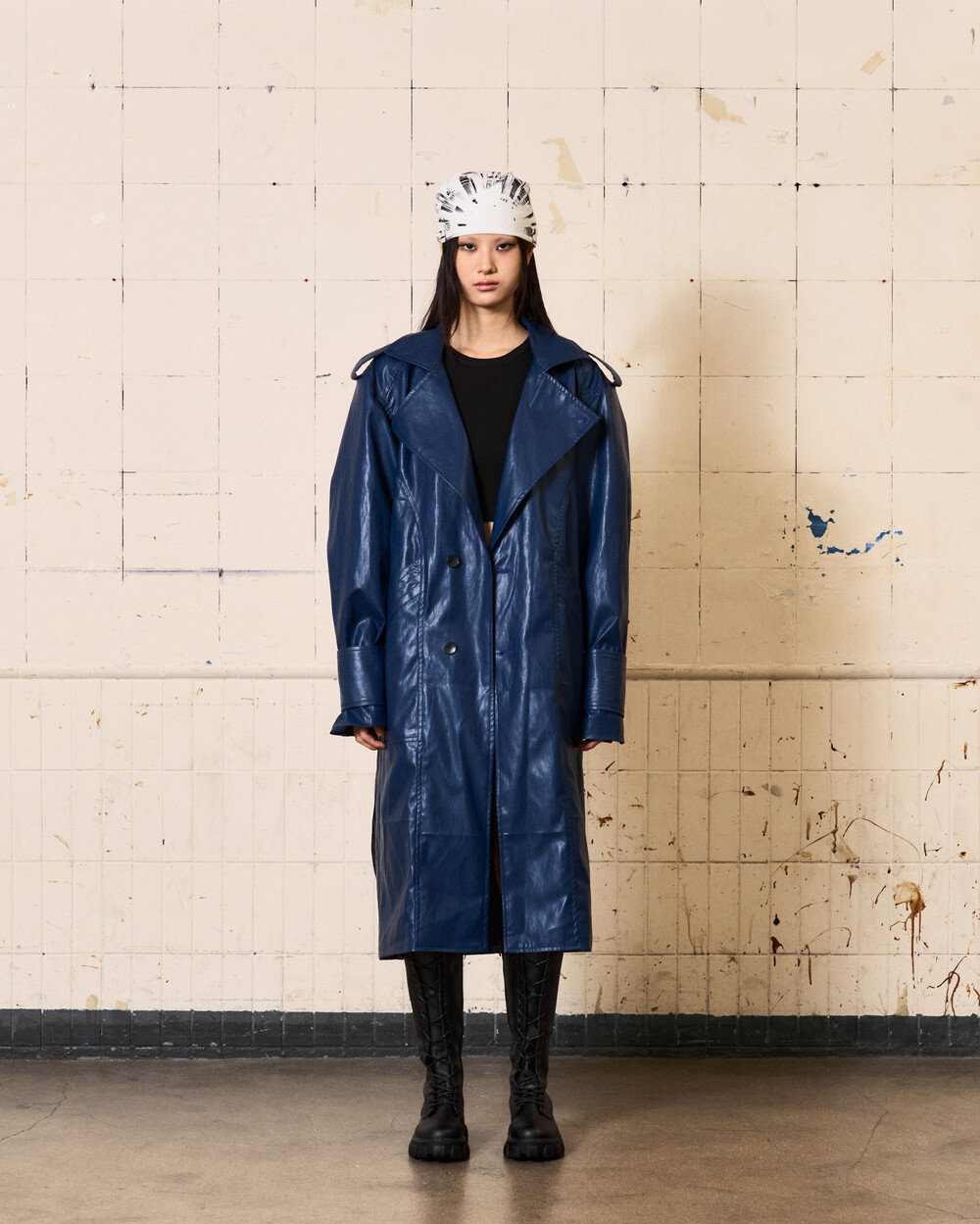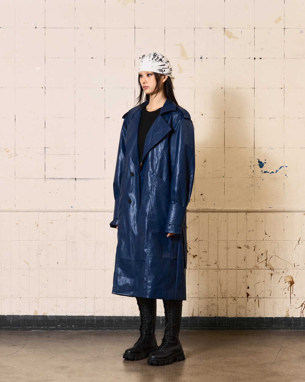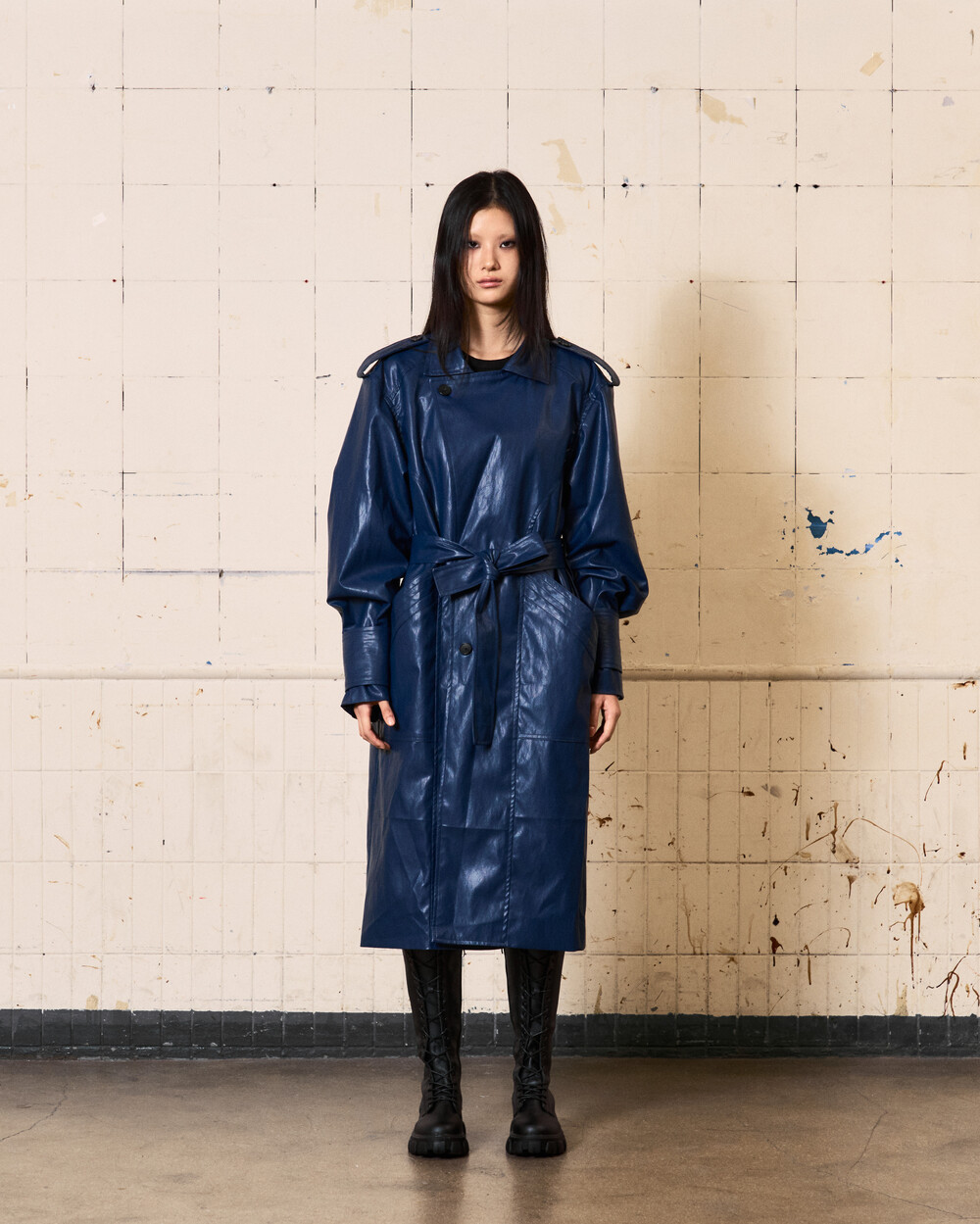 - Faux Leather 원단의 앞판 커브디테일이 들어간 레더코트 입니다.