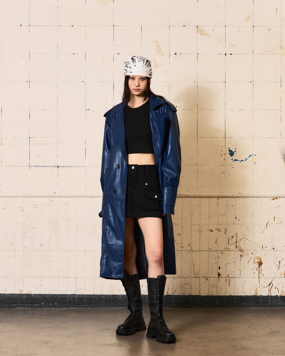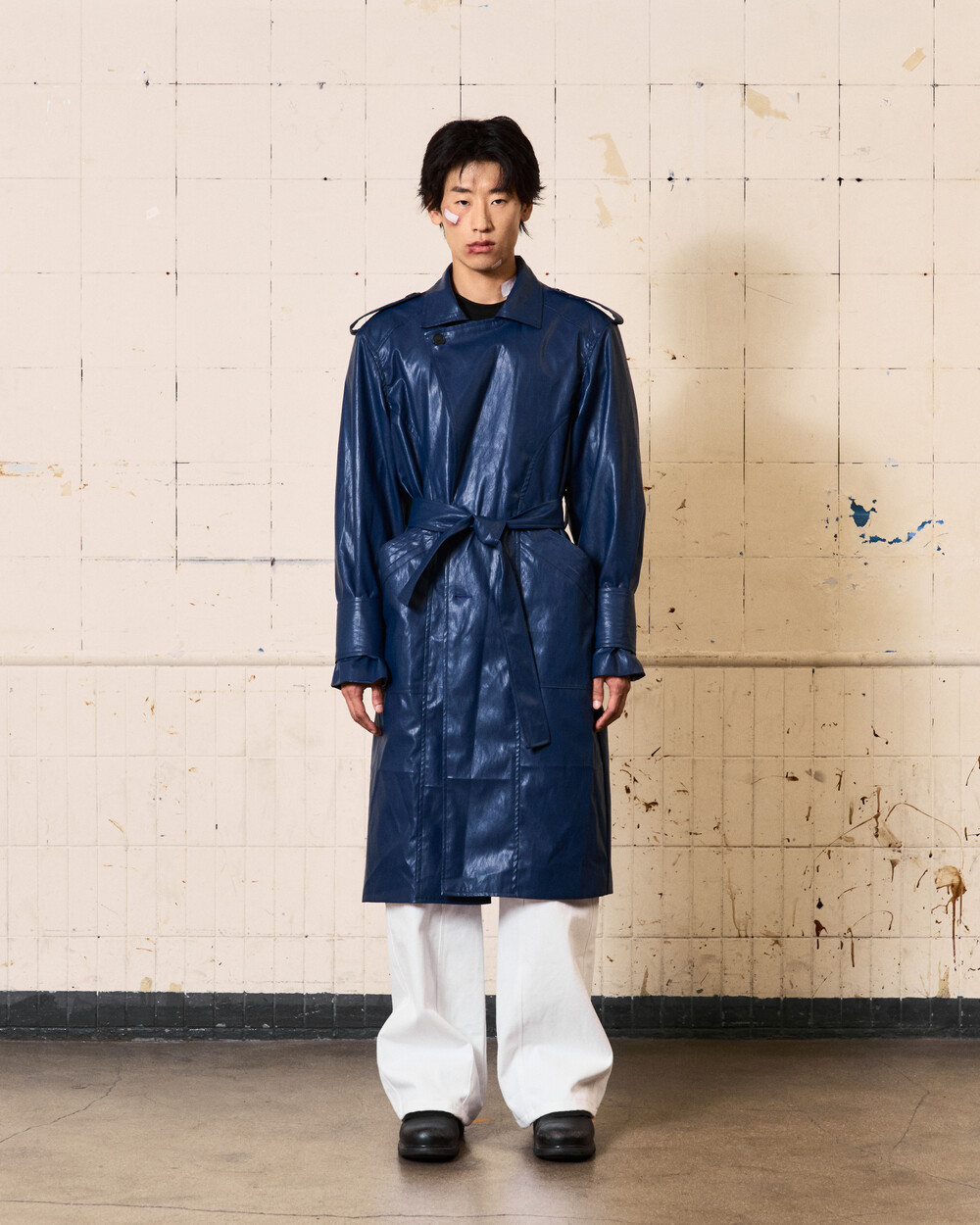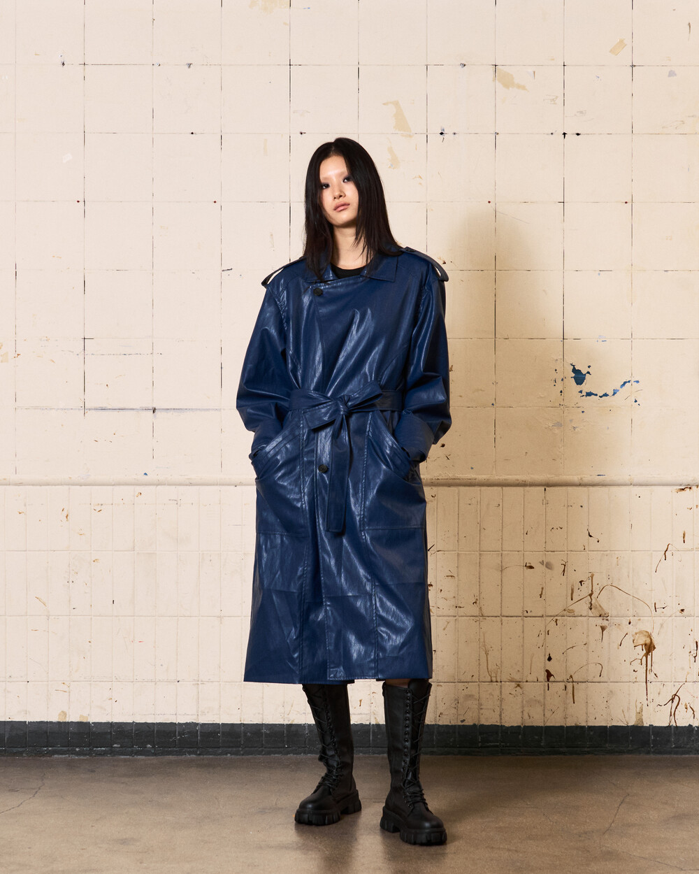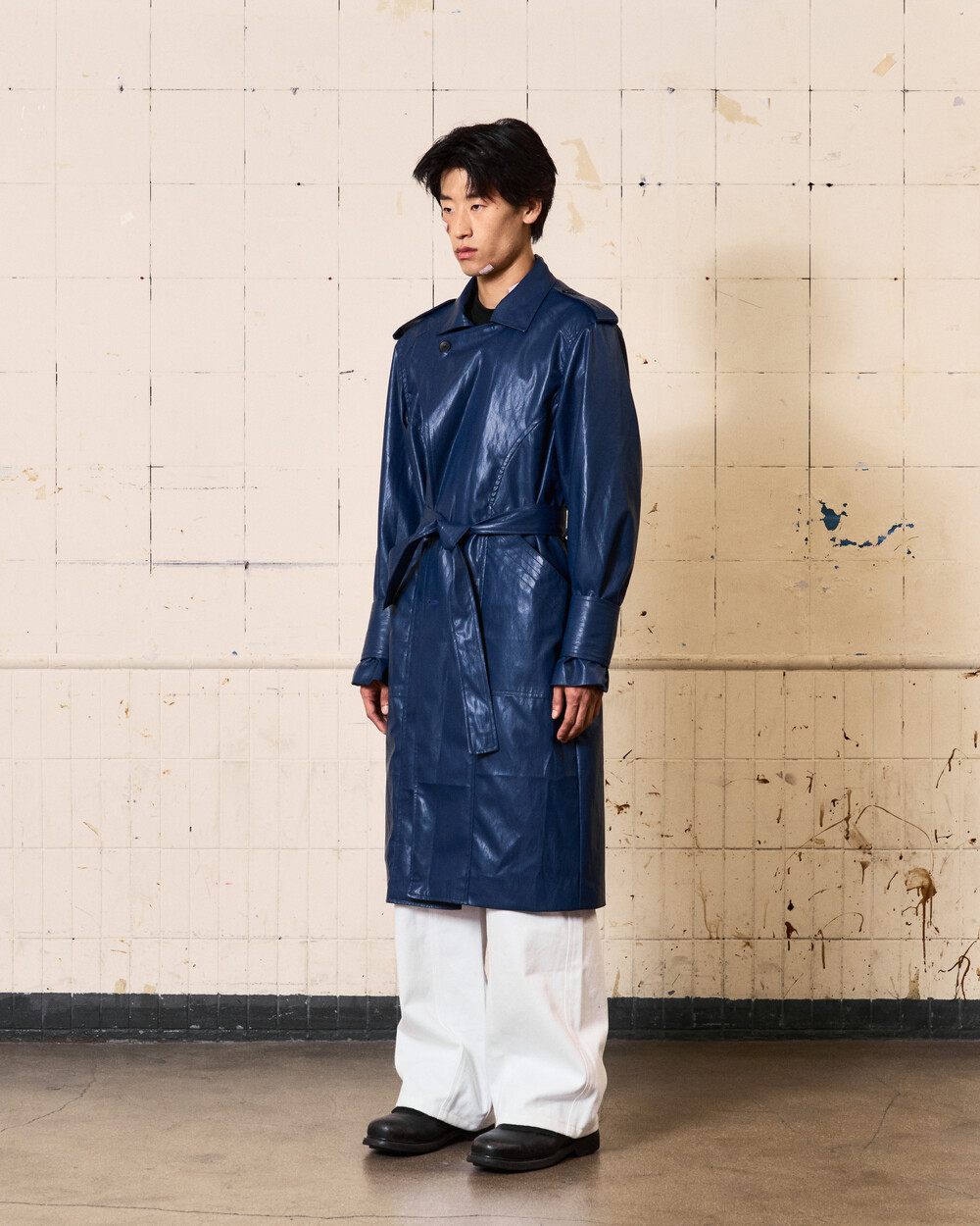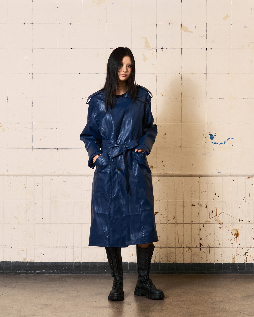 - Faux Leather 원단의 앞판 커브디테일이 들어간 레더코트 입니다.