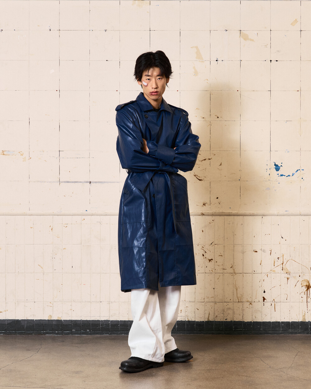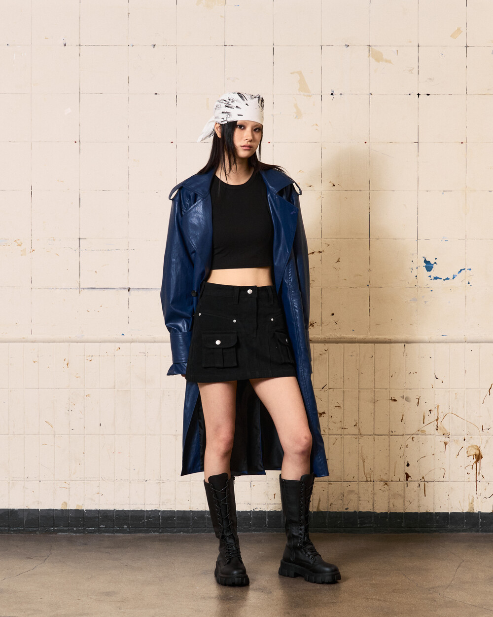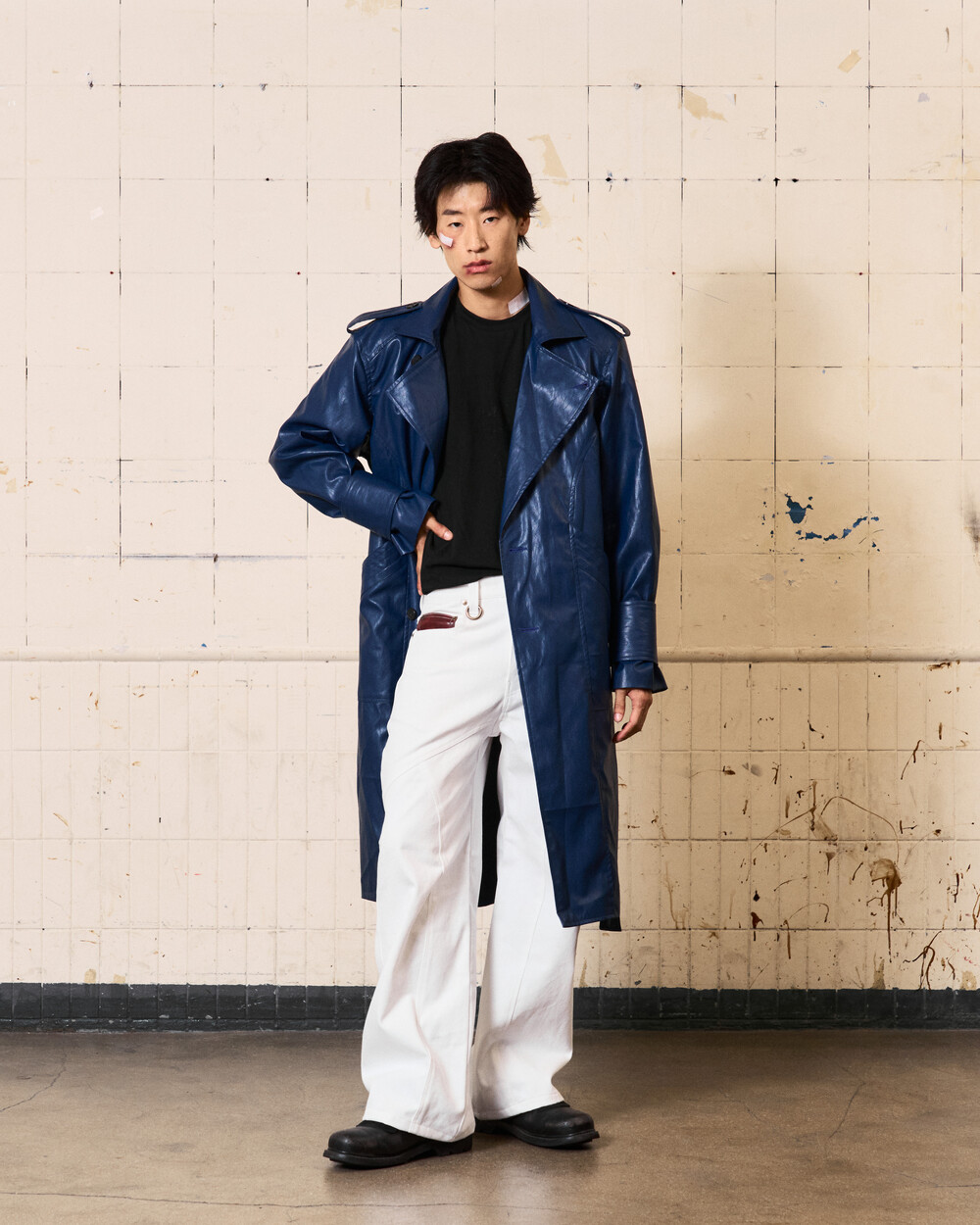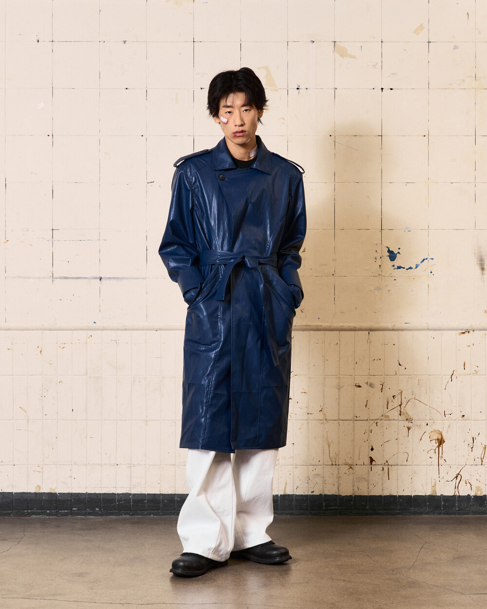 - Faux Leather 원단의 앞판 커브디테일이 들어간 레더코트 입니다.