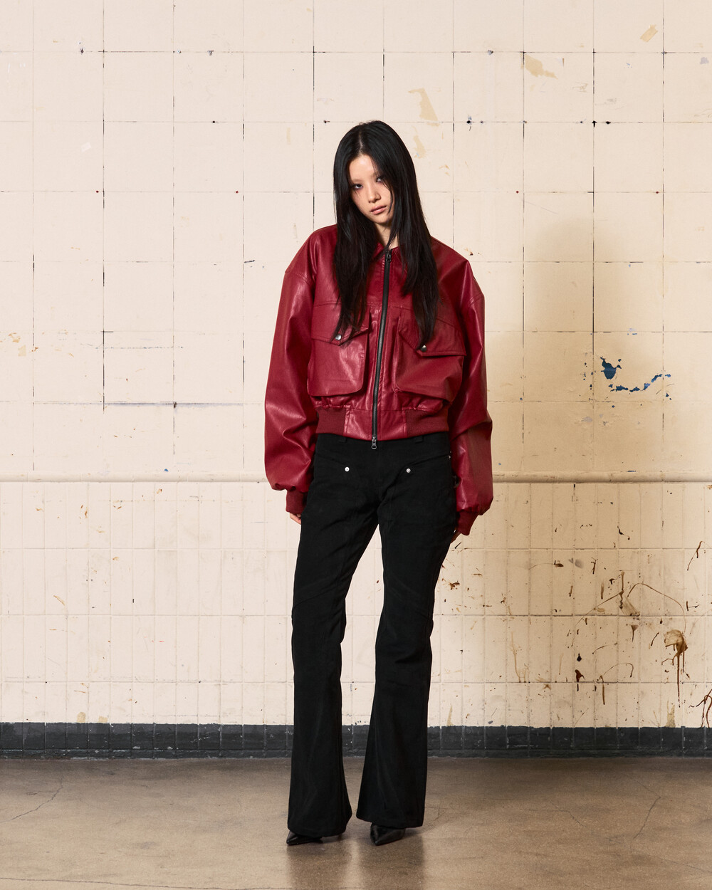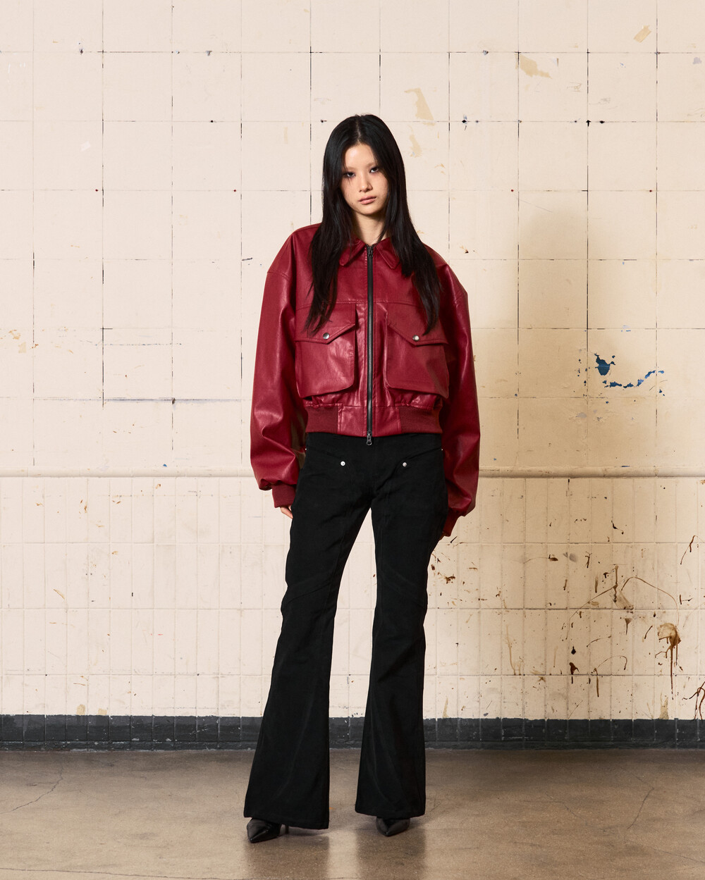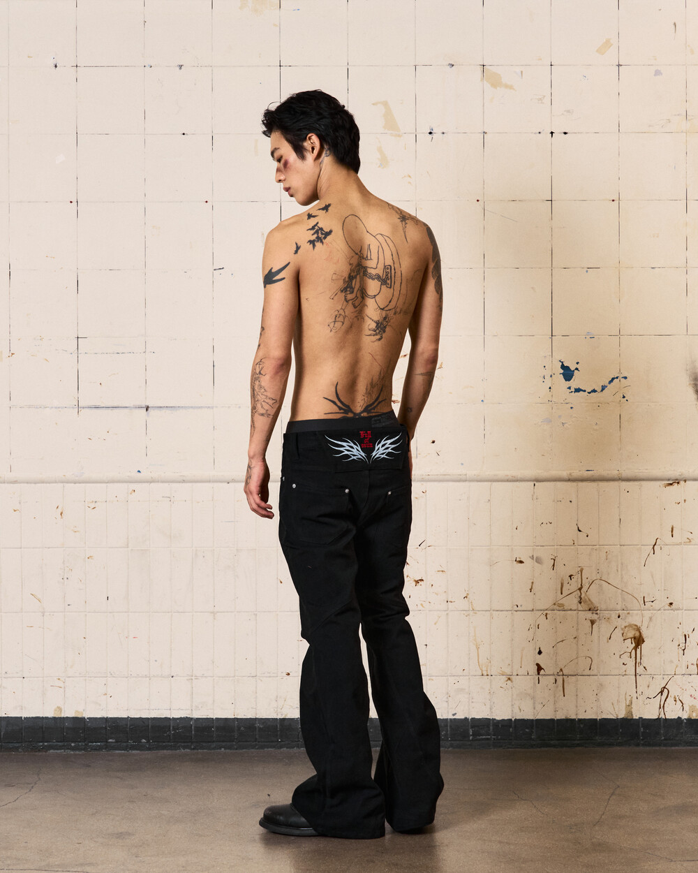 - 아이코닉한 커브 절개 디테일이 들어간 플레어핏의 로우라이즈 팬츠입니다.
